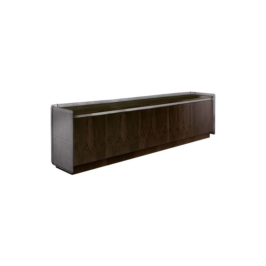 Mayson is made up of three materials: wood, leather and metal. They integrate each other creating an element that both elegantly contains and displays objects. The leather seems to embrace the sideboard upholstering the whole exterior surface except the doors and the top surface. Then there is the metal that provides the piece with a touch of brilliance.
