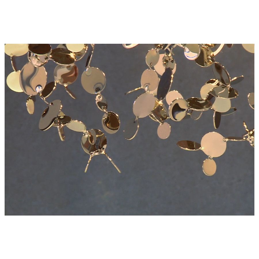 Model składa się z wielości lustrzanych płytek połączonych metalowymi nitkami, tworzących kompozycję przypominającą gałąź drzewa lub krzew.