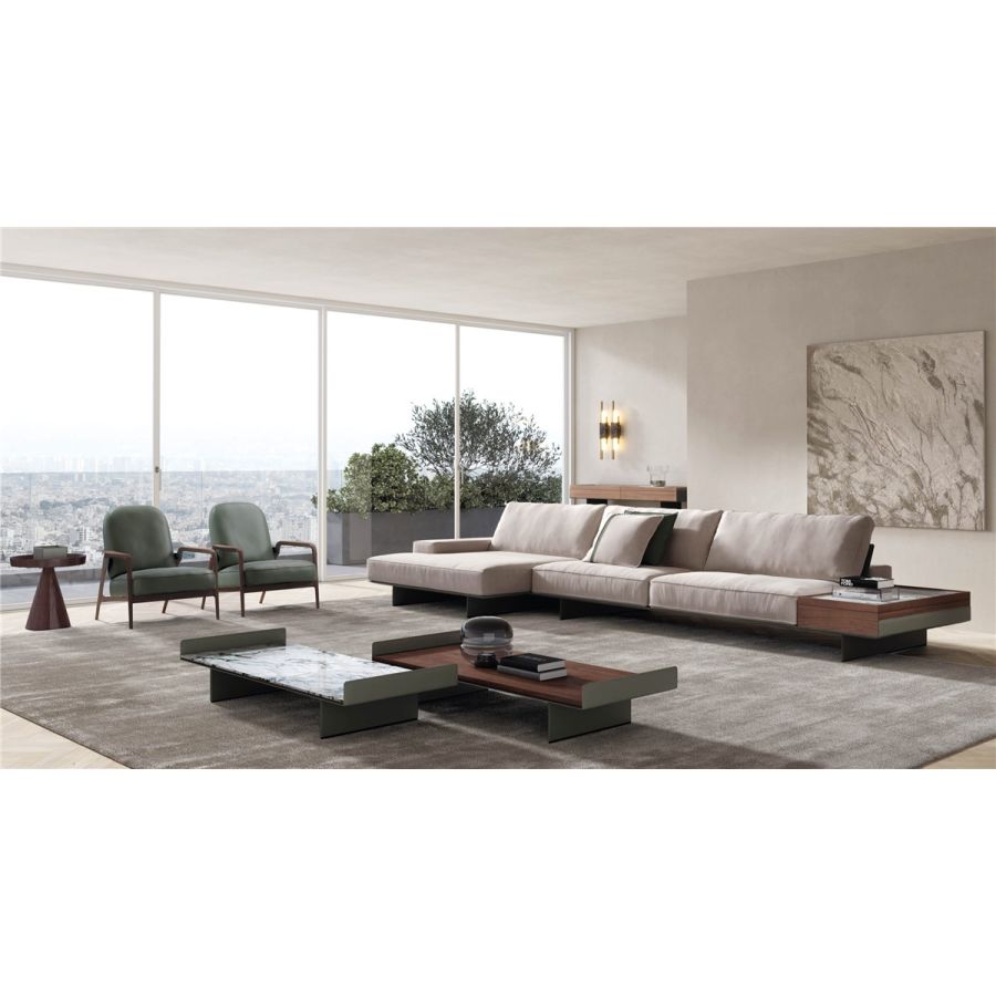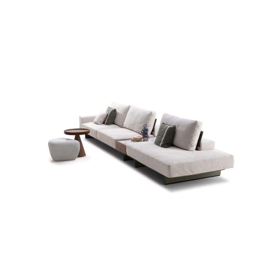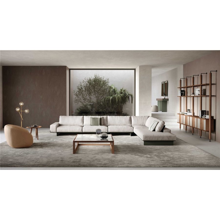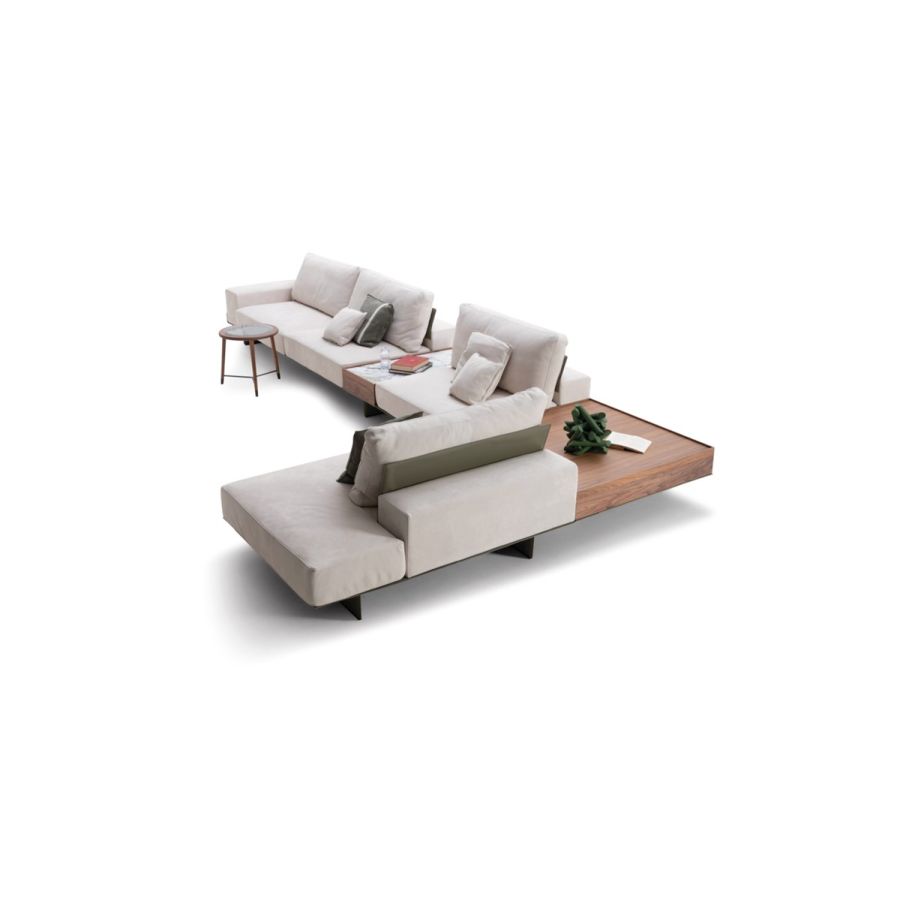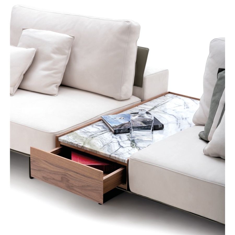 A sofa and a system. The lightness of thoughts and the balanced shapes were created with thin metal sheets covered in leather. Our Granville is designed to create a modularity hovering above the ground in the atmosphere, still maintaining all the same refined and precious elements. These can be produced in two sizes of pillow and sitting, being free to decide the desired composition. It is useful to use wood containers as terminal or central part, combined with drawers to insert pillows, magazines or other objects. At sight-container we have different materials at disposal like the marble or the leather. The comfort of the pillows and the abundant shapes of the armrests make the Granville an elegant, refined and timeless system you can adapt to different spaces and solutions.