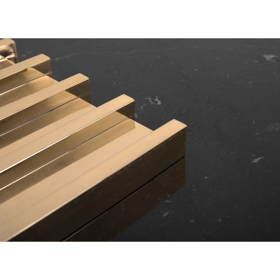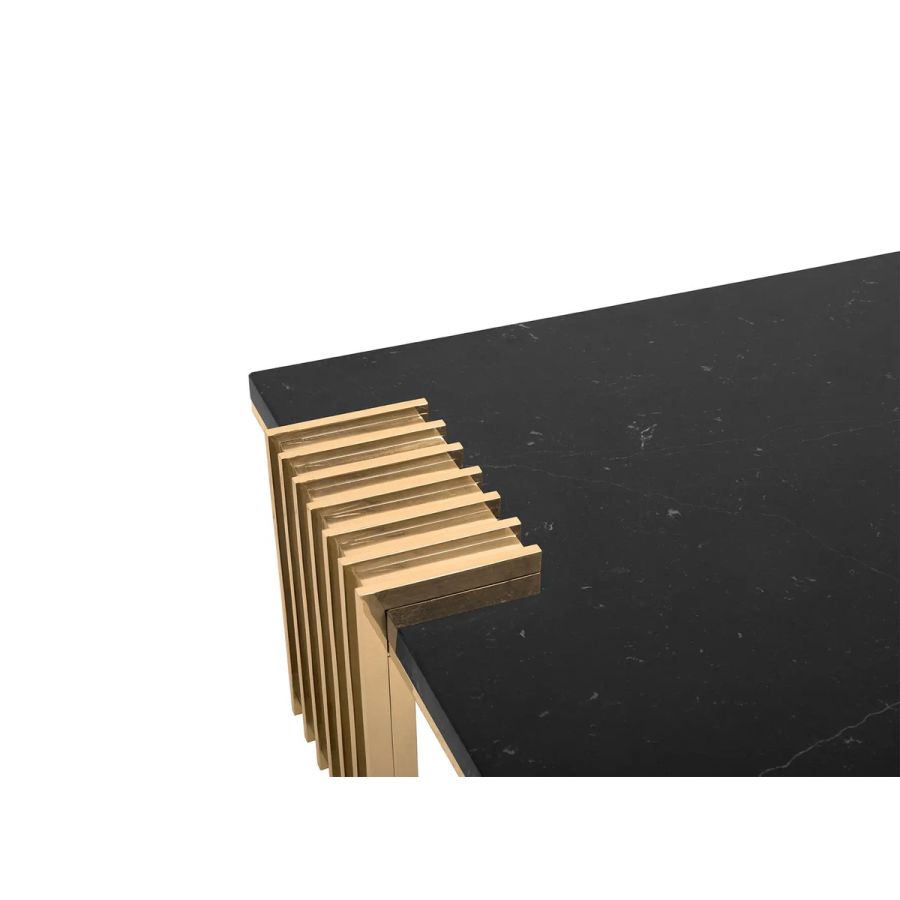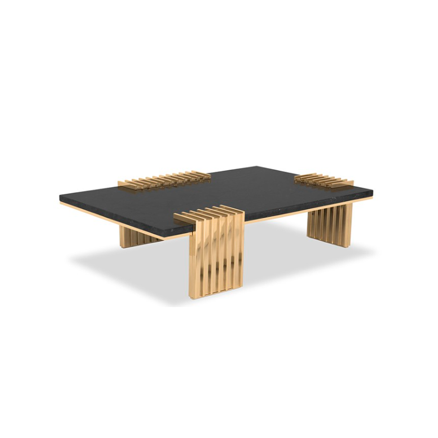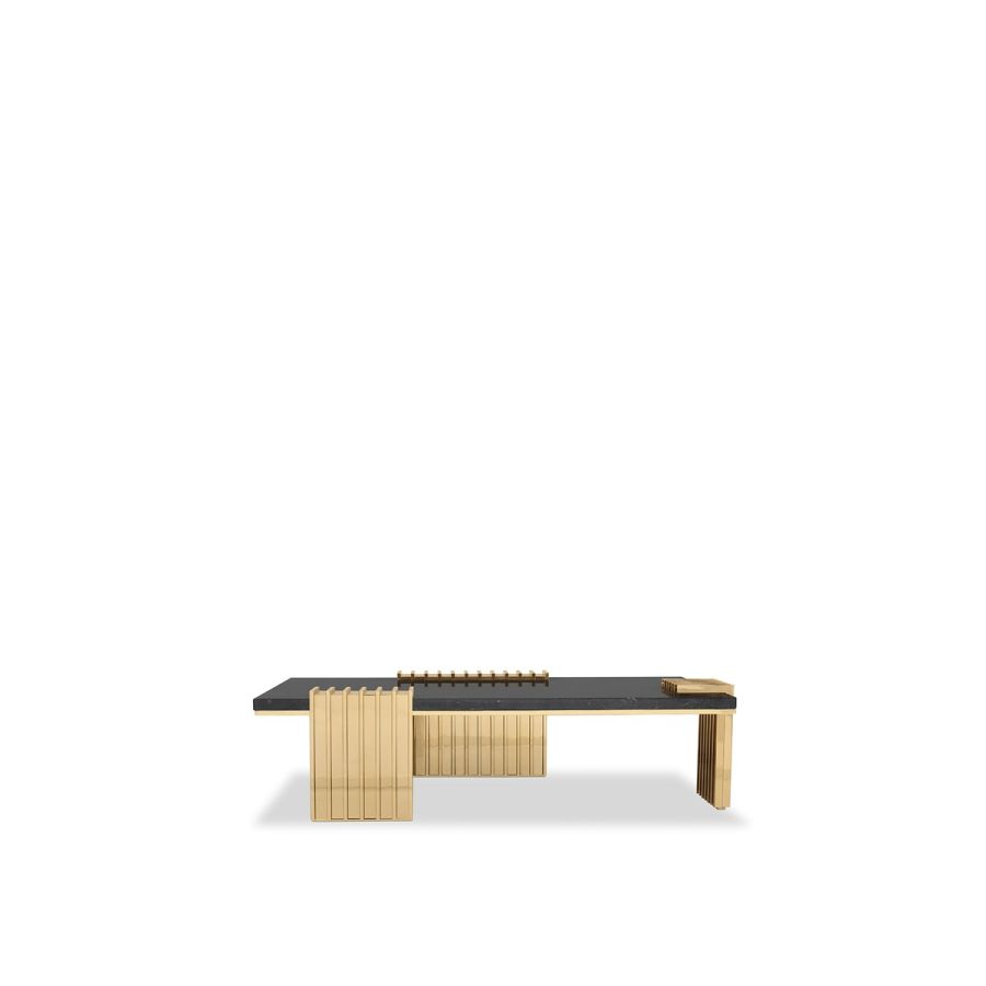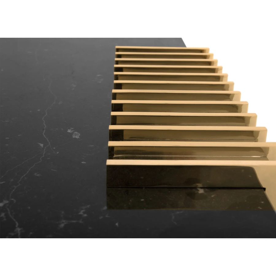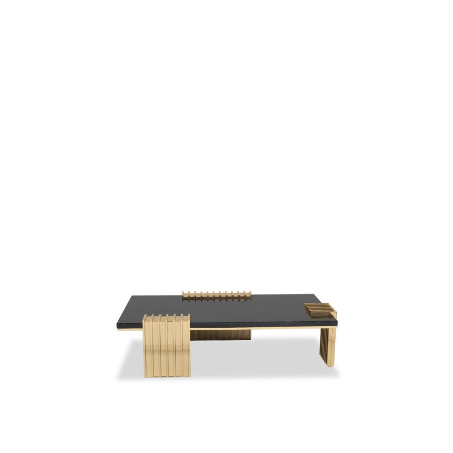 The Vertigo Center Table was made with a sleek design, giving it a classy feel and a luxurious appeal. The unusual forms in gold-plated brass involve the Nero Marquina marble, creating a captivating centerpiece that enhances the ambiance of any living room.