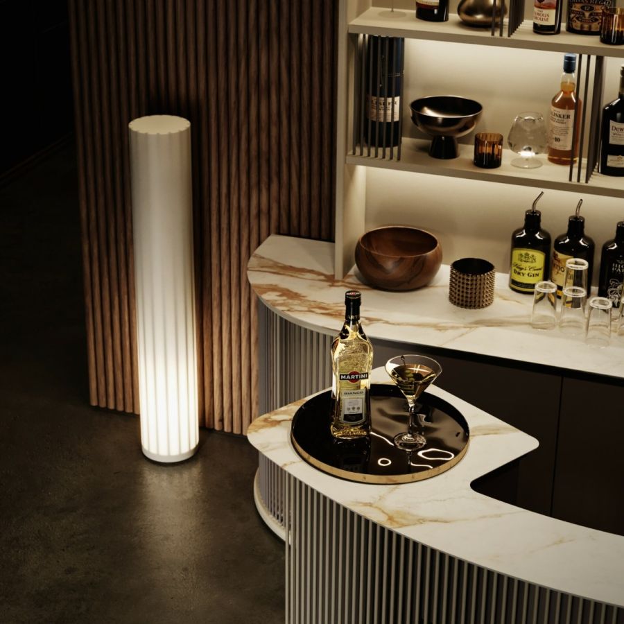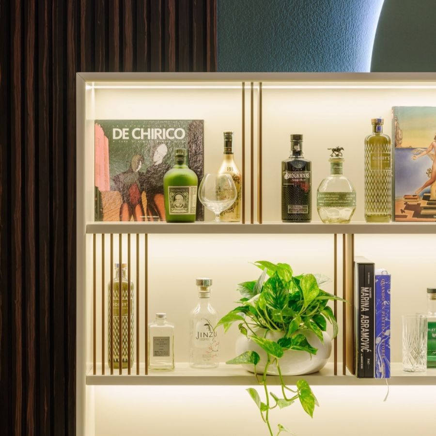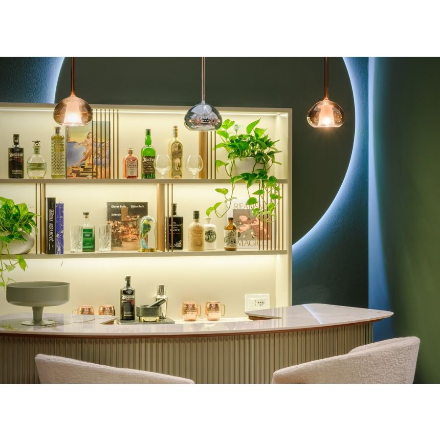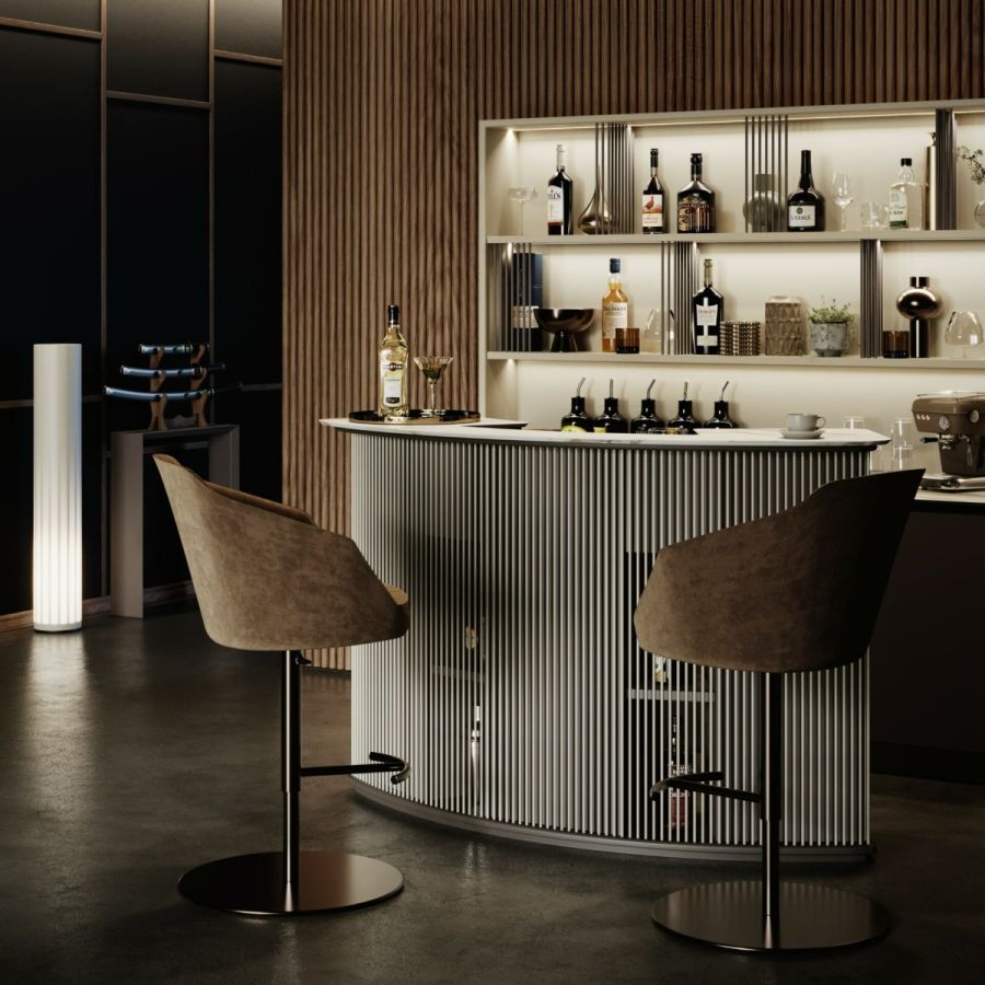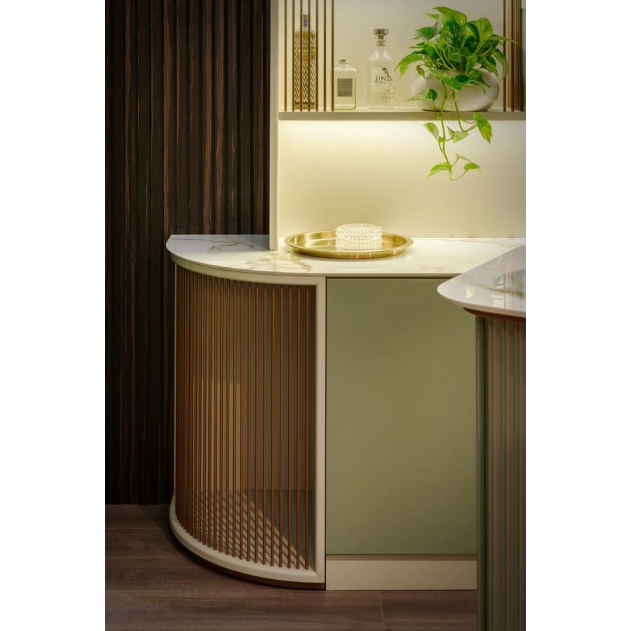 The counter is a modern curved pieces with working space, and the wall element is the place where to put and showcase precious bottles. The counter and wall element have a polished Calacatta Vecchia Macchia ceramic top, beautiful and very resistant.