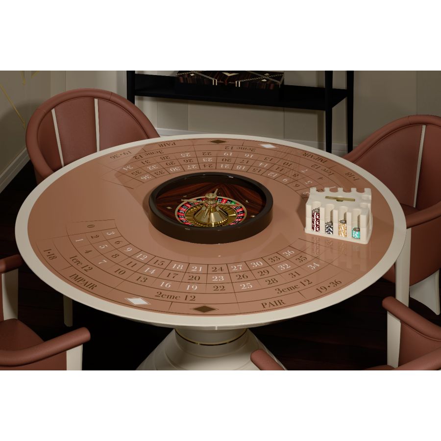 At the center of the Roulette Table, the professional wooden roulette triumphs, elegantly covered by a Lazy Susan.