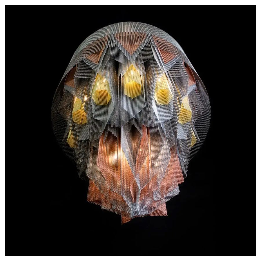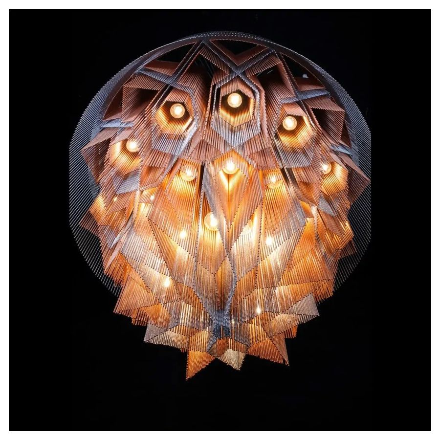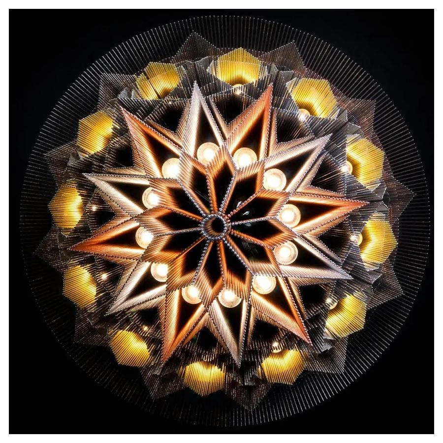 The ceiling mounted version of a massive intense Illuminated Mandala sculpture inspired by Islamic patterns which have been translated into three dimensions through the extrusion of the complex interlocking geometry. Illuminated by suspended G4 Halogenor LED lamps.