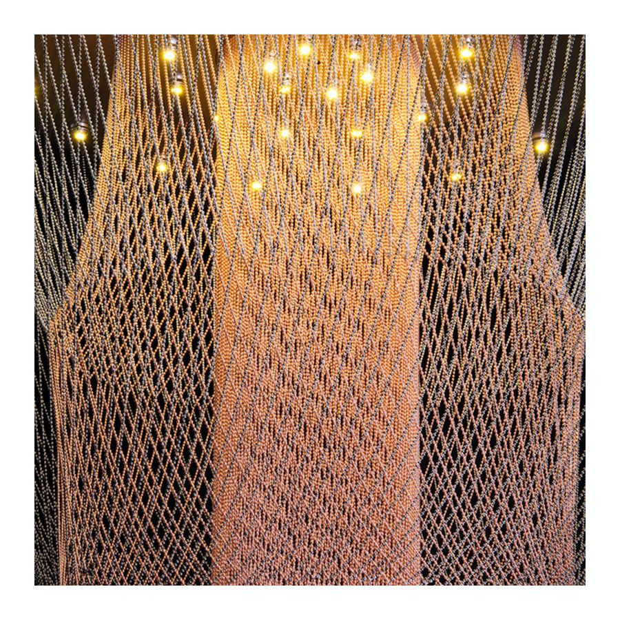 A futuristic ghostlike semi transparent form. The success of this design results from an ingenious clip device which has enabled us for the first time to attach the ball chain to itself! This allows for dynamic and distorted curves to be created. The idea is inspired by Antoni Gaudi who used inverted chain models in the structural design for the Sagrada Familia. Illuminated by 35 surface mounted and suspended G4 LED Lamps. This version is mounted onto the ceiling directly.