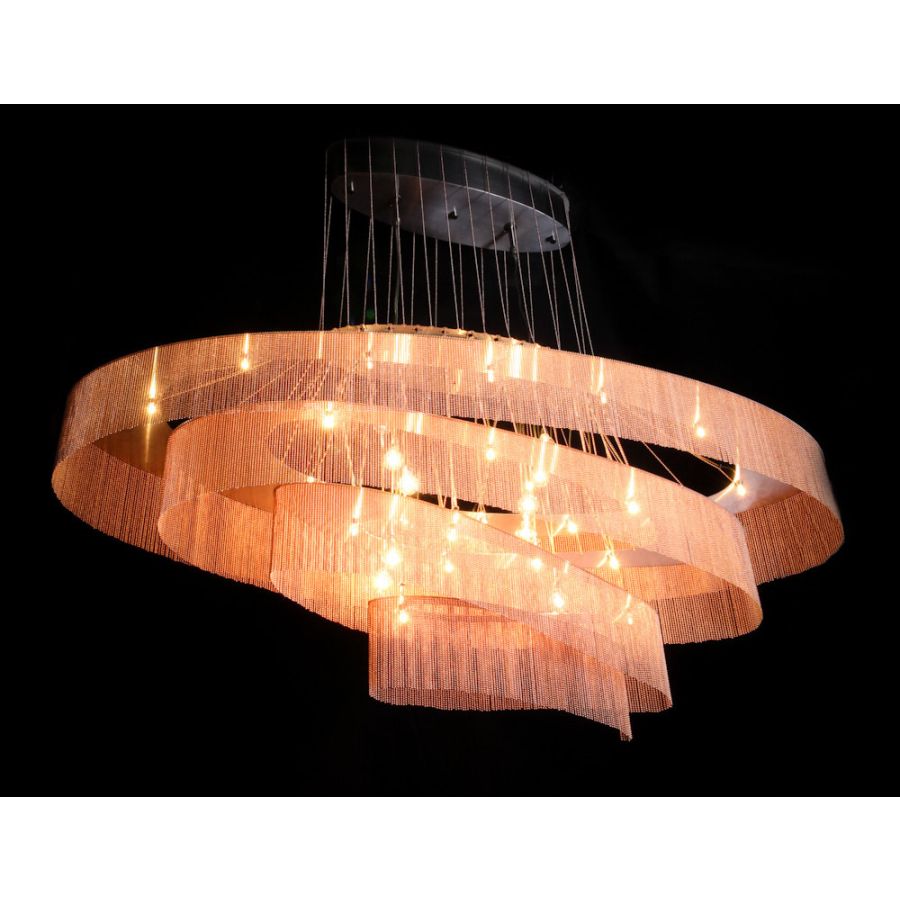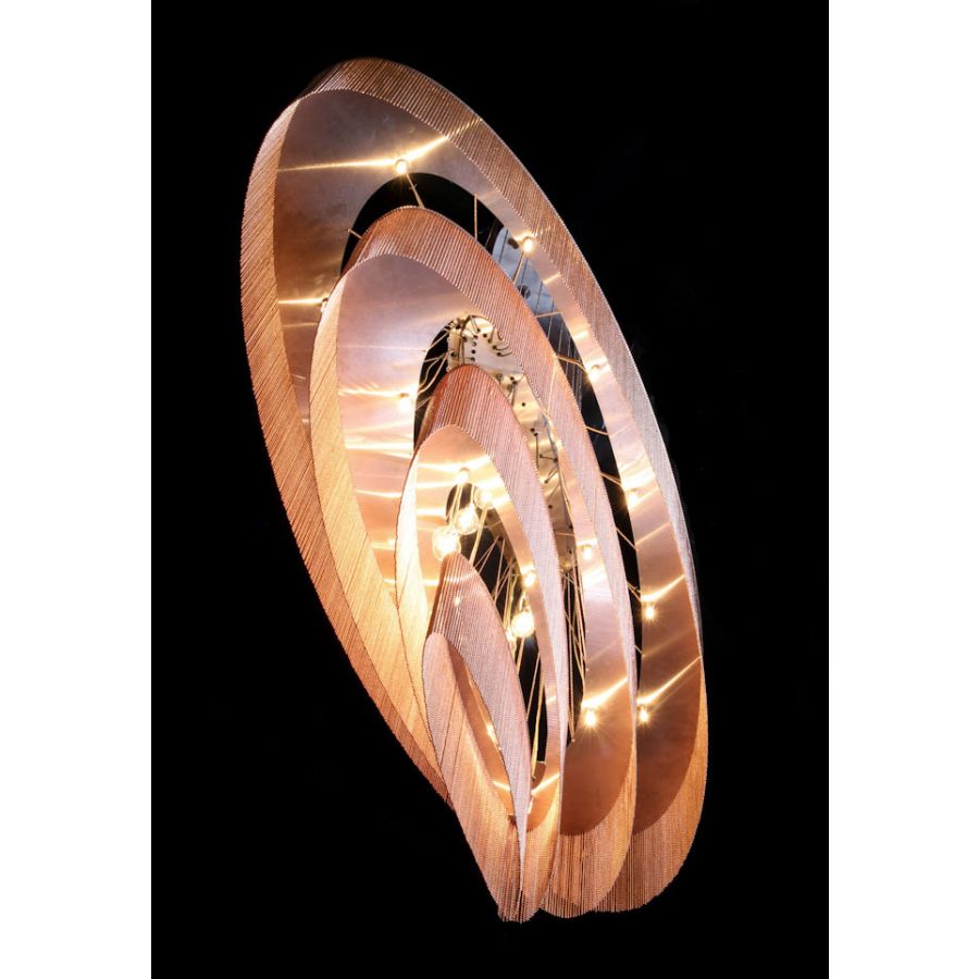 Elongated spiralling art-chandelier inspired by galaxies. Illuminated by 10W G4-Halogen or LED electrical systems one with 12 suspended glass balls and another with 20 surface mounted lamps on the spiralling metal frame. Ideal for a linear space or over a long table.