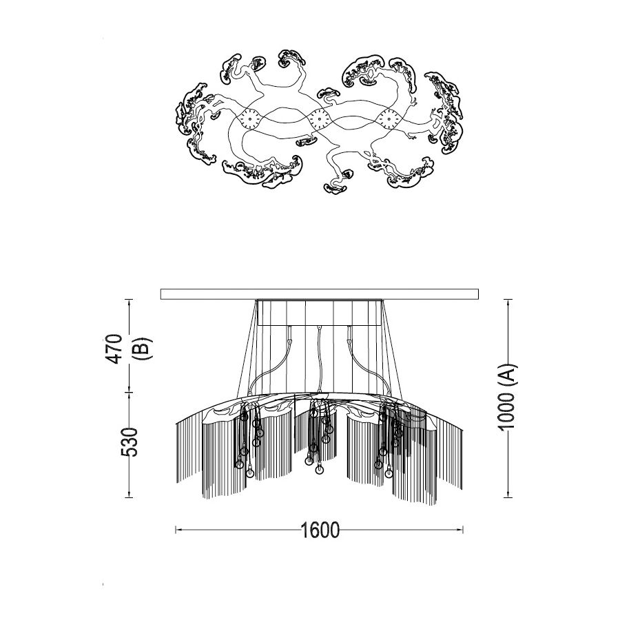 An elongated chandelier inspired by trees constructed from a bowing 2D graphic metal frame. Illuminated by G4 Halogen lamps within 18 suspended glass balls. Suitable for a linear space or over a long table.