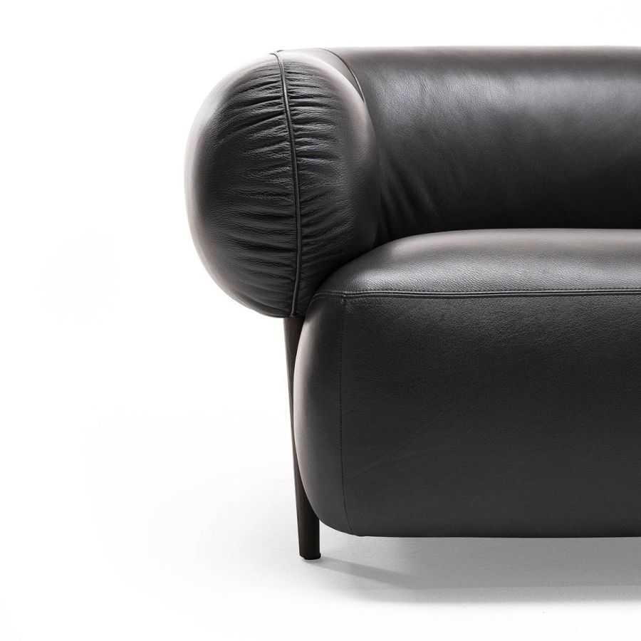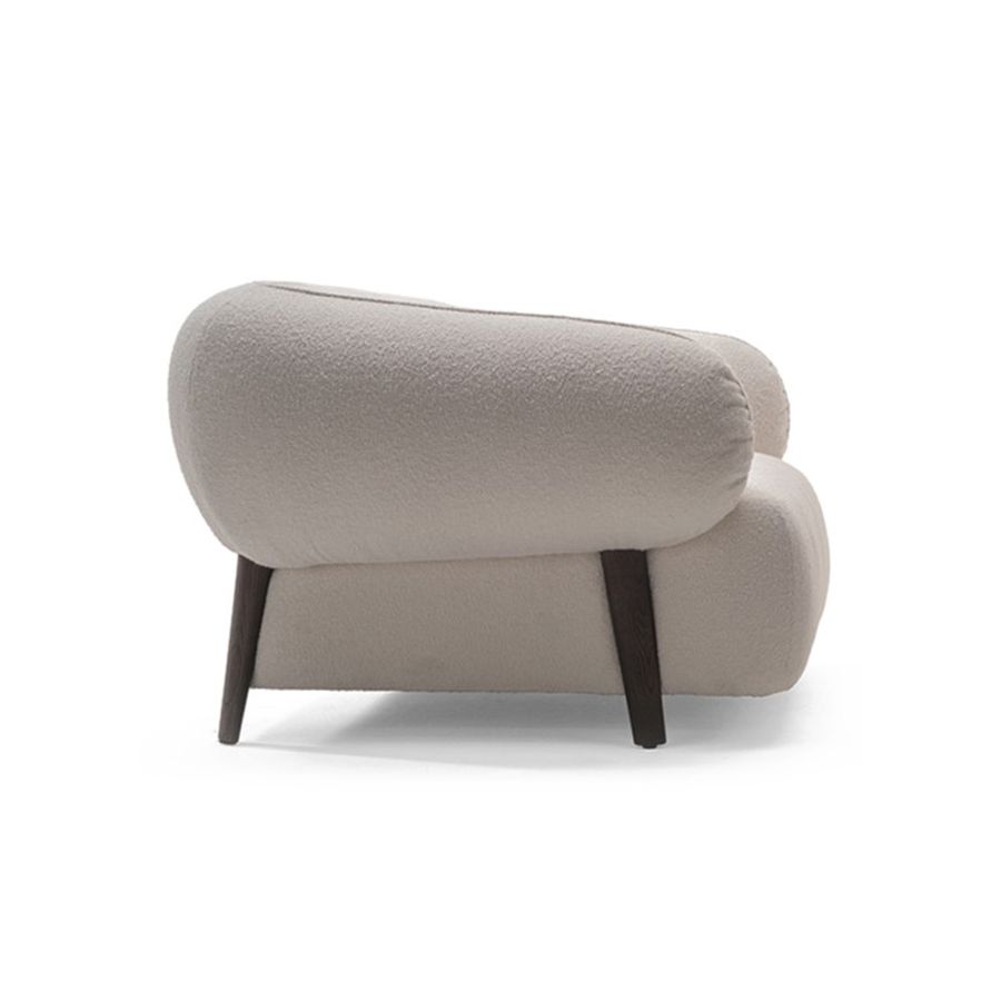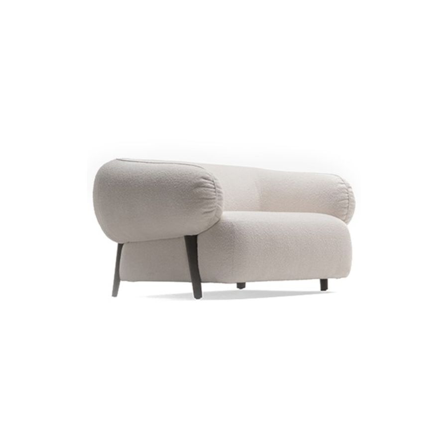Comfortable living room in modern style Its soft shapes invite you to let yourself be embraced by the comfort of the roller backrest. The comfortable structure in solid wood stained gray gives great character to the seat. The CAROL family consists of an armchair, sofa and pouf footrest.