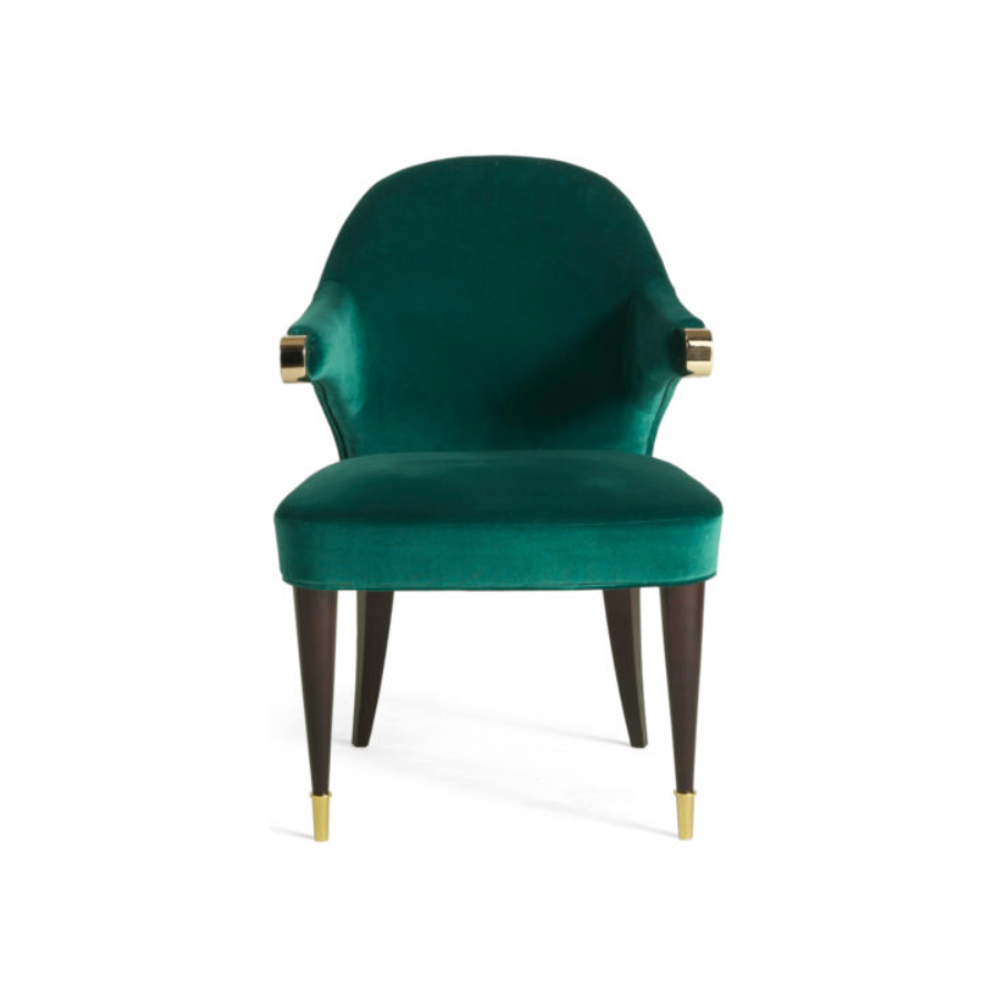 Elegant armchair with superb emerald green fabric with fabulous brass details and an iconic shape. Its design is the result of research and tradition, its style reveals the true spirit of high quality furniture. Finished with fine materials based on ancient artisan techniques handed down over the years from father to son.