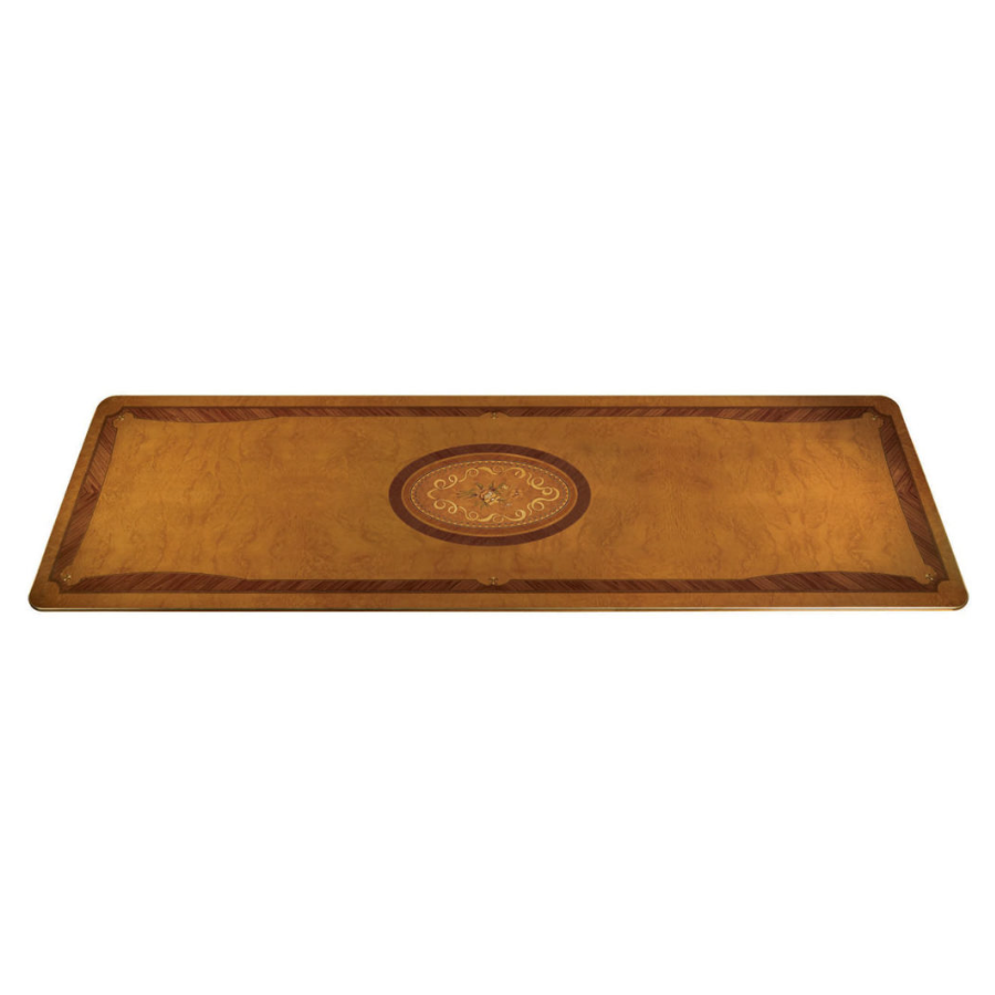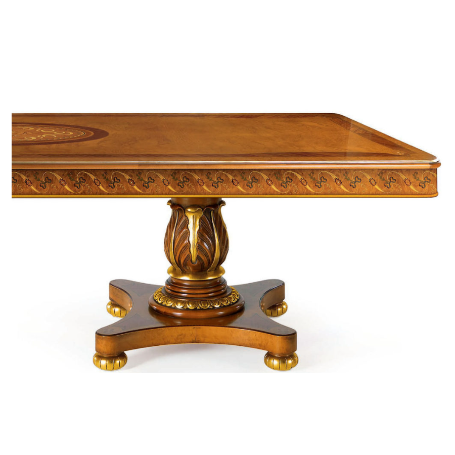 Refined classic style dining table in pickled oak with gold leaf details featuring an elegant top in finely inlaid wood. Its handcrafted workmanship according to the Brianza tradition gives this complement a unique and personal touch that makes its beauty timeless and classic forever.
