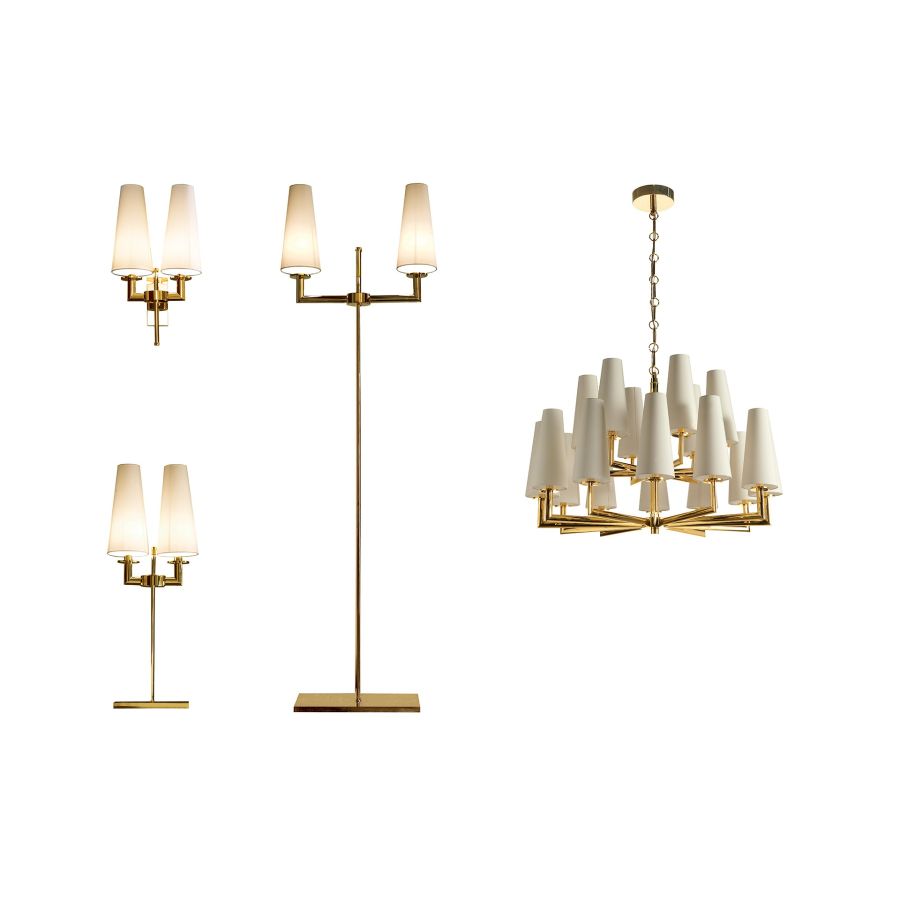 Elegant set of lights with gold plated finish consisting of chandelier, floor lamp, wall lamp and table lamp.
