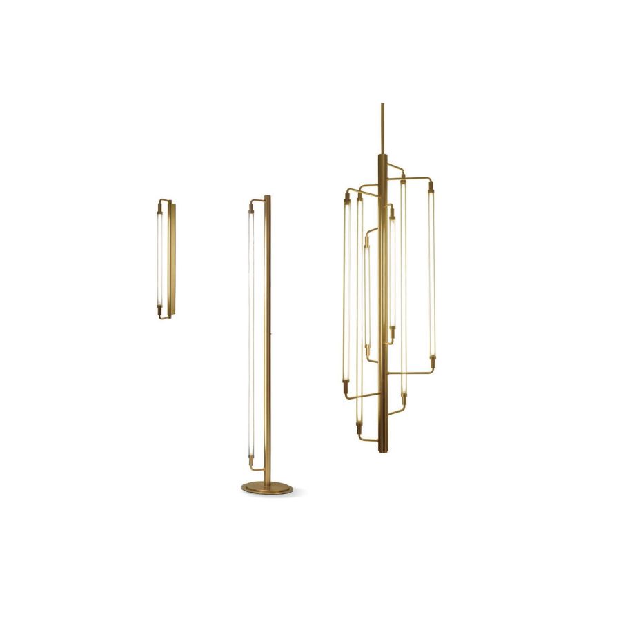 Set consisting of a wall lamp, lamp and chandelier in modern style in brass with a satin gold finish. The elegant and refined design of the diffuser allows these elements to adapt to any type of context.