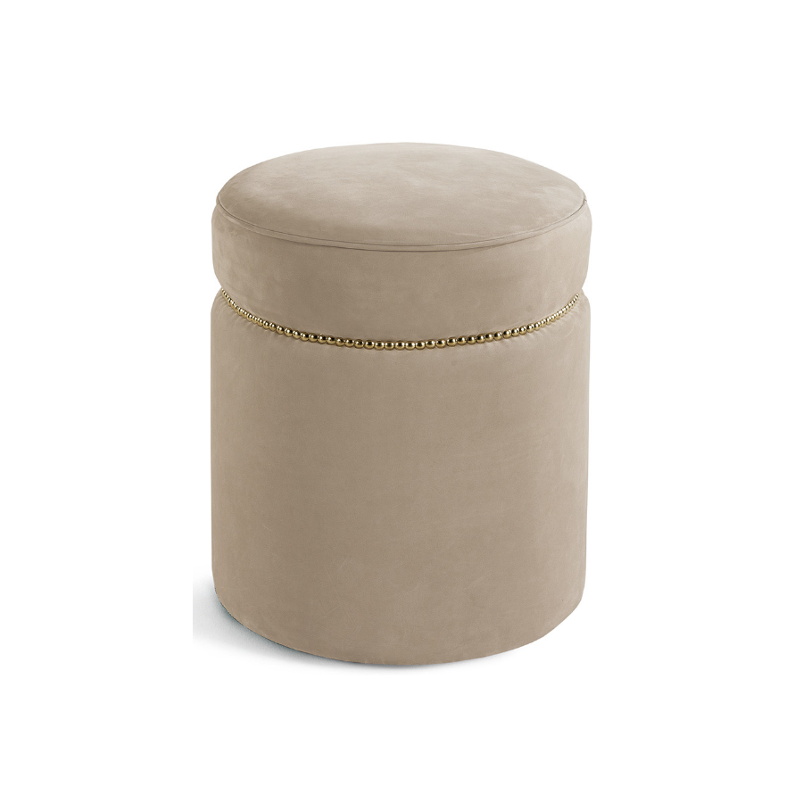 Elegant pouf with gold finishings that can be used as an extra seat or as a comfortable footrest.