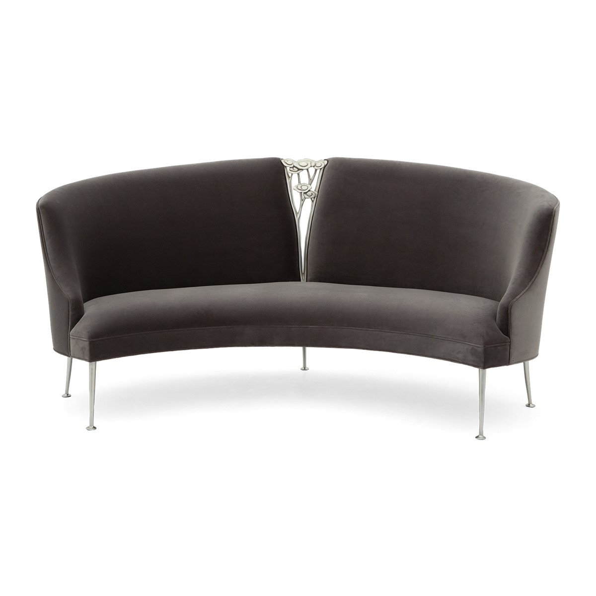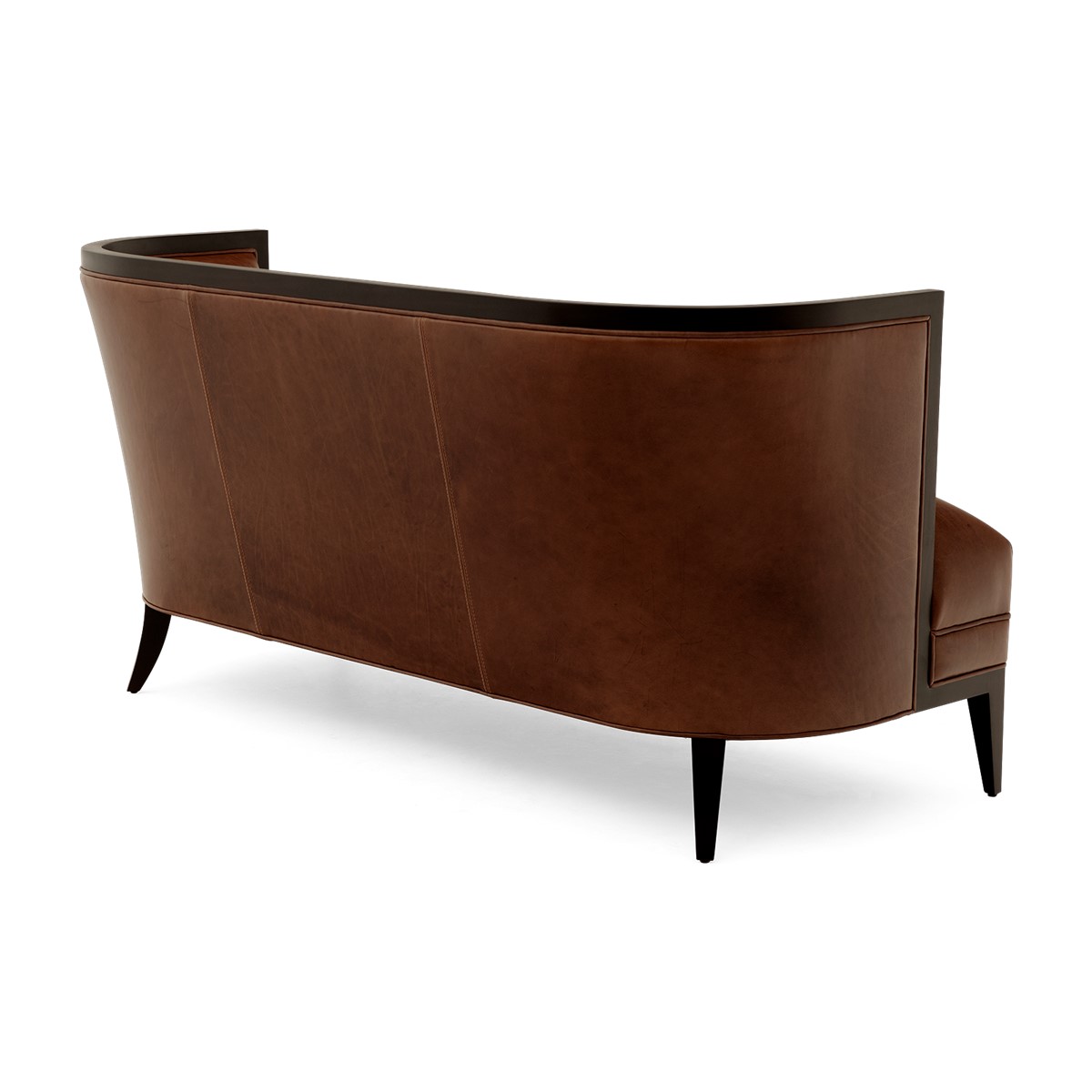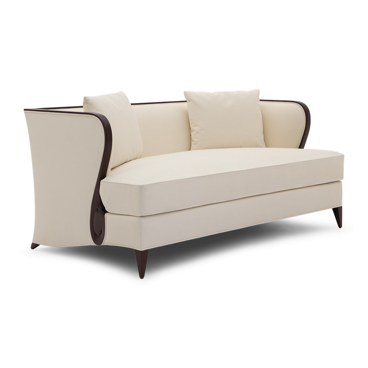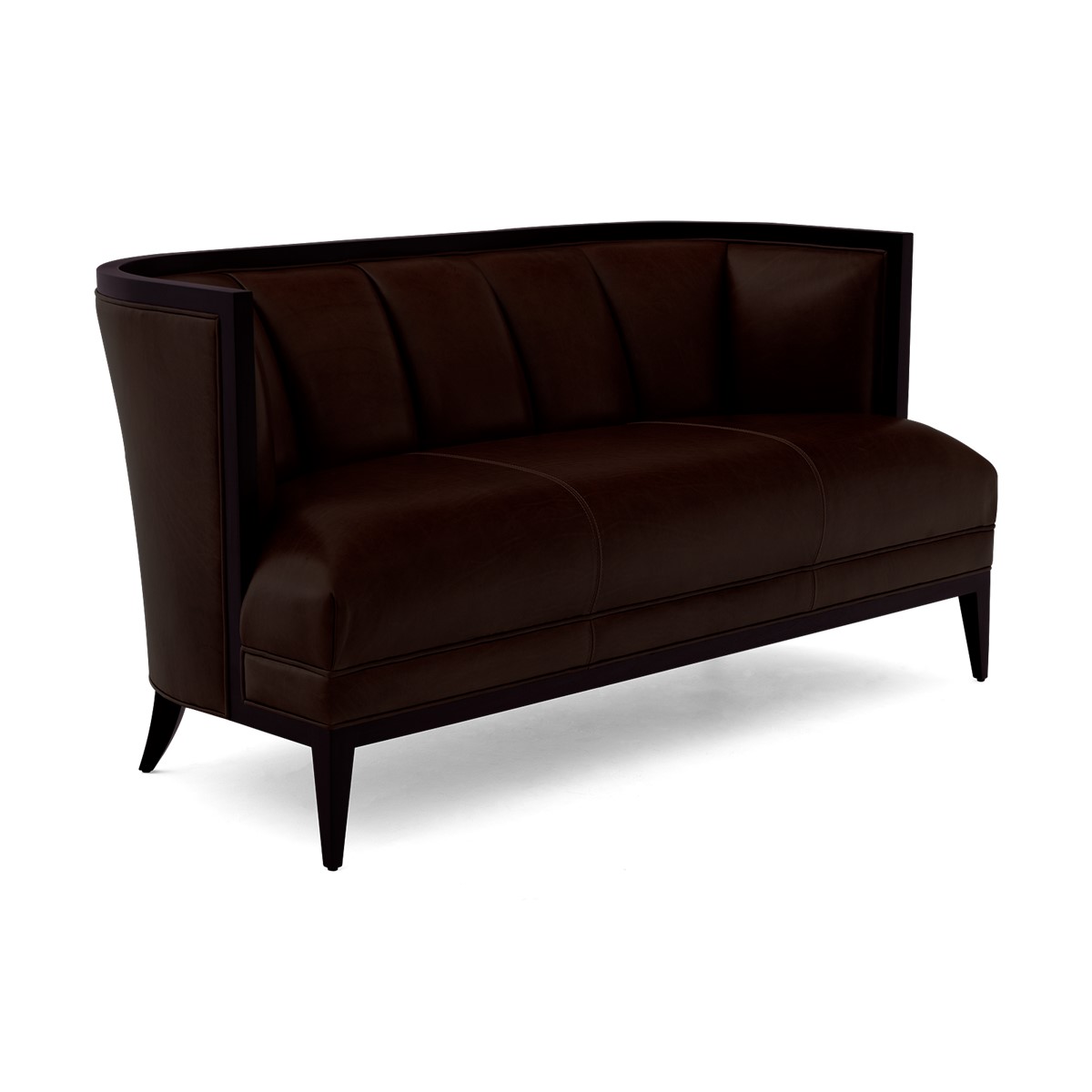 Refined upholstered and sumptuously formed, dining height settee featuring Christopher Guys signature Silk-cut behind the gently sloped back.