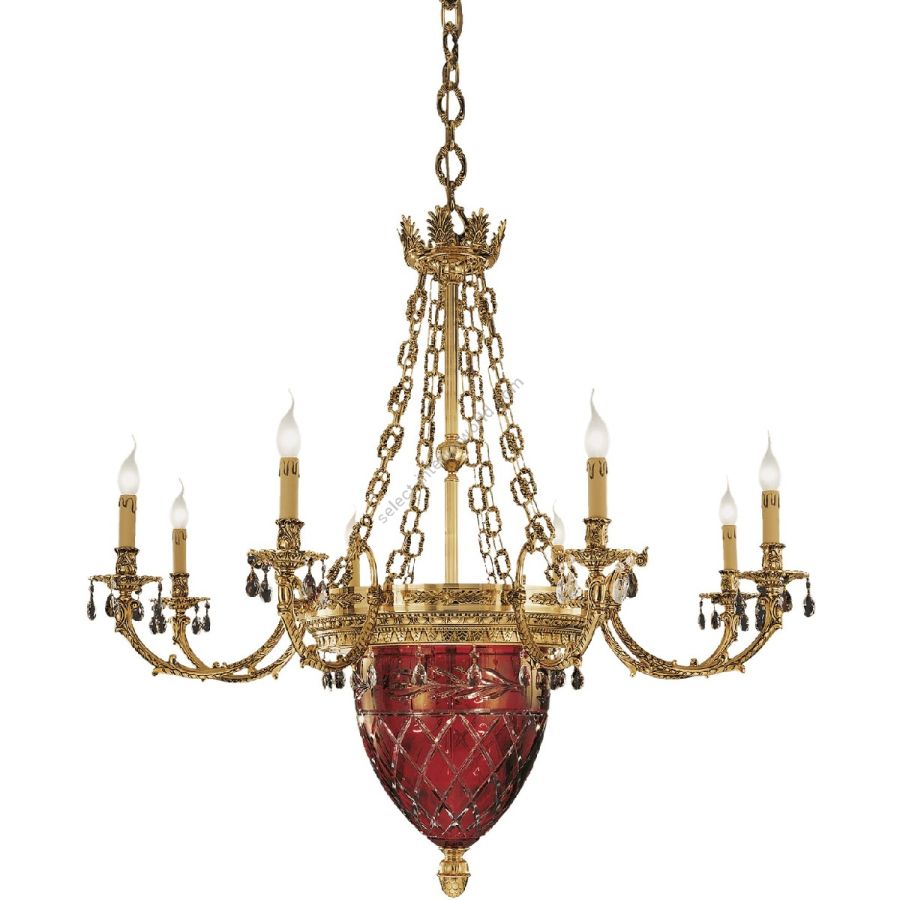 Shaded gold plated finish chandelier with red crystal and Schoeler drops