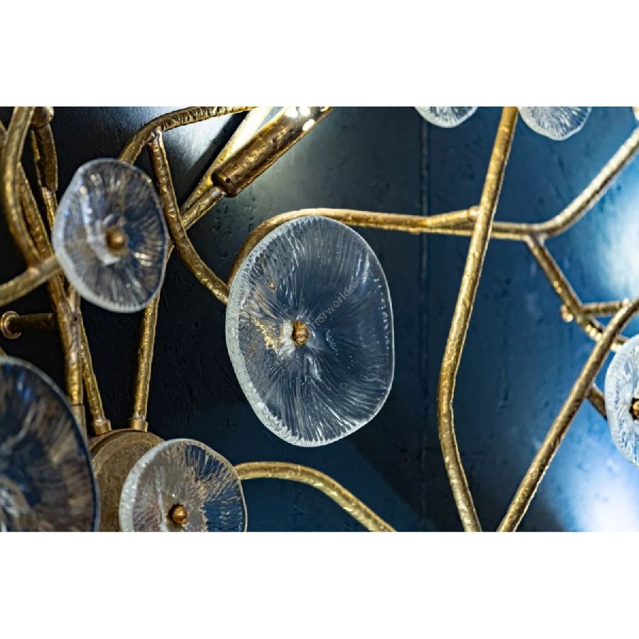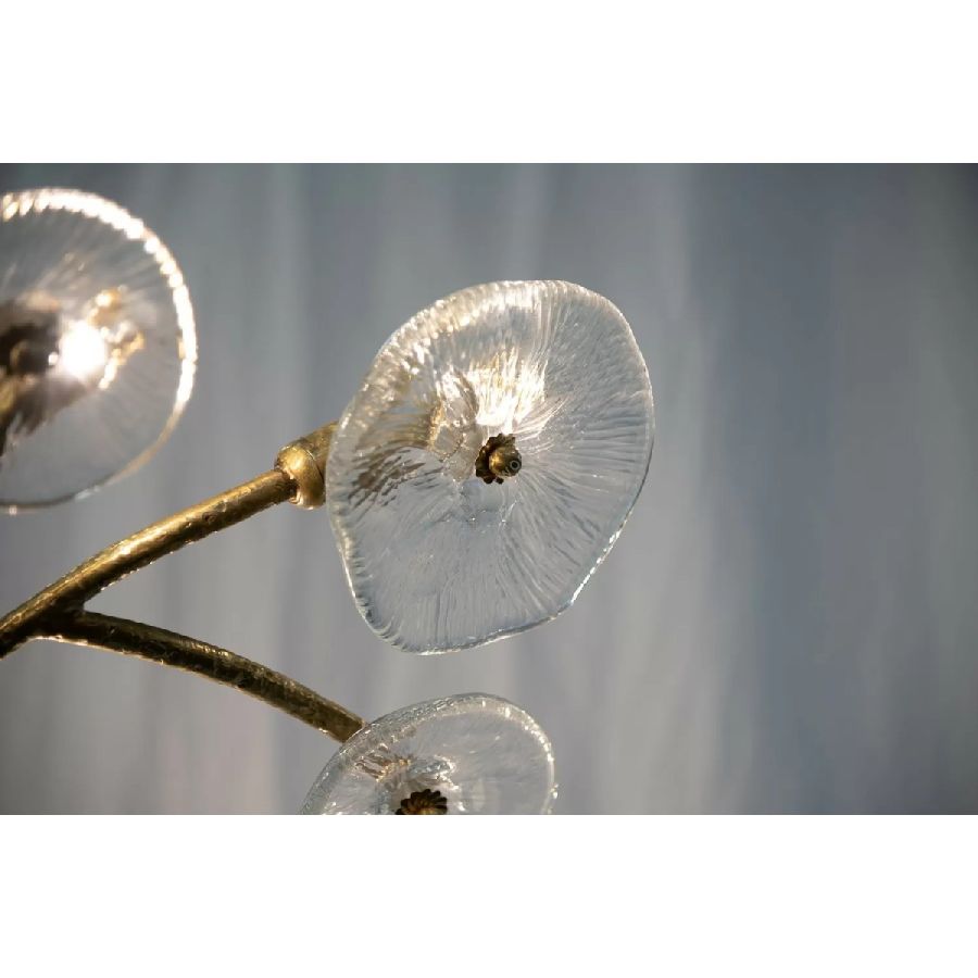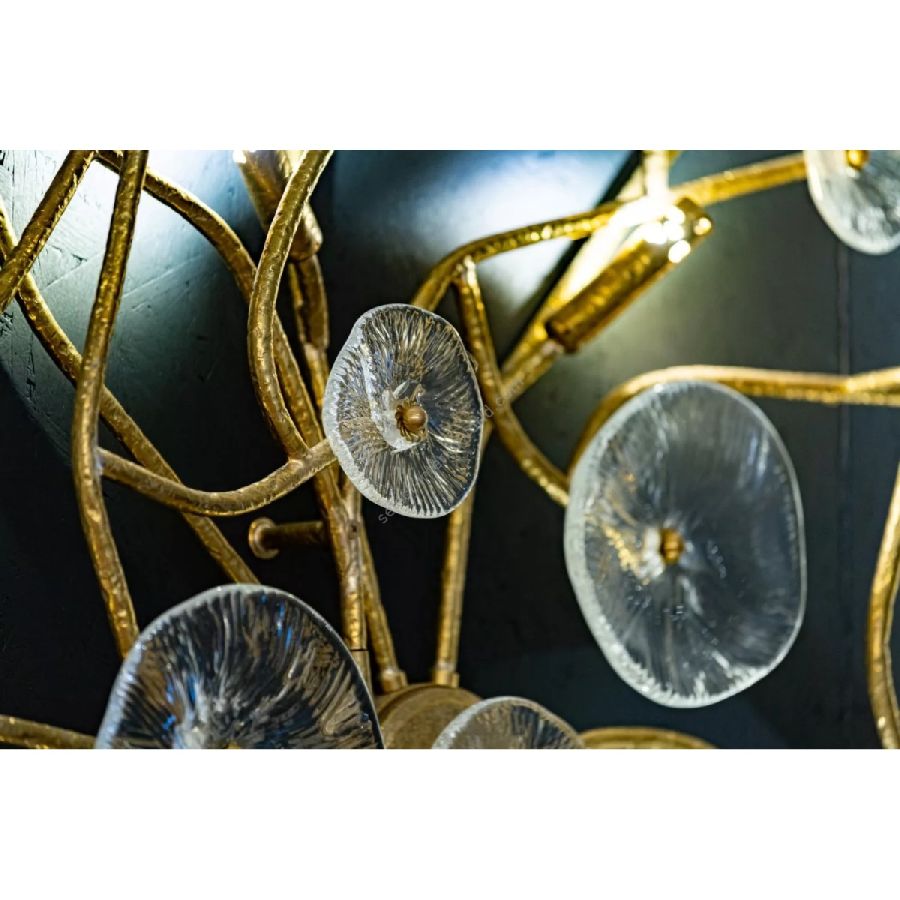 The flower meadow is the inspiration of this spectacular collection, where the glass forged as a simple flower decorates and embellishes the hammered brass structure. Here it is presented in ceiling and wall versions, but it is suitable for developing lots of solutions to adapt to the most diverse lighting needs. The finish is in Natural Brass, but can be customized