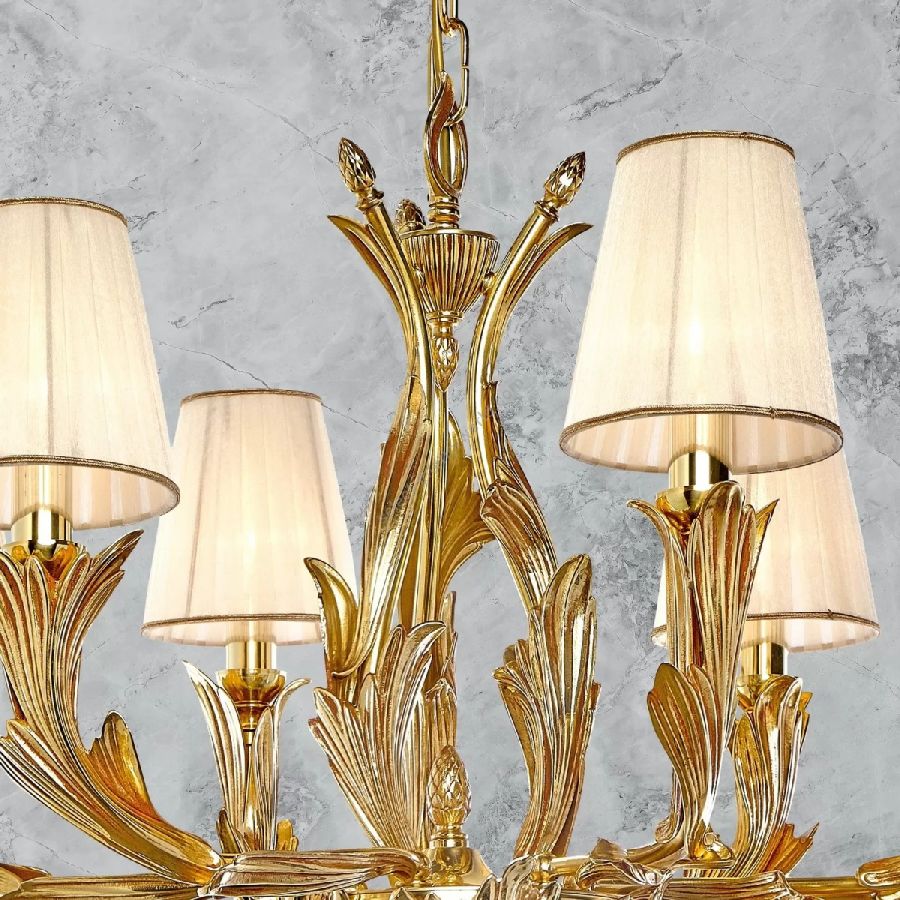 The brass leaves, manually welded one by one, cover the structure of the chandelier and table lamp of this collection, presented in the French Gold finish and combined with cream-colored organza lampshades. Customizable in finishes and sizes.
