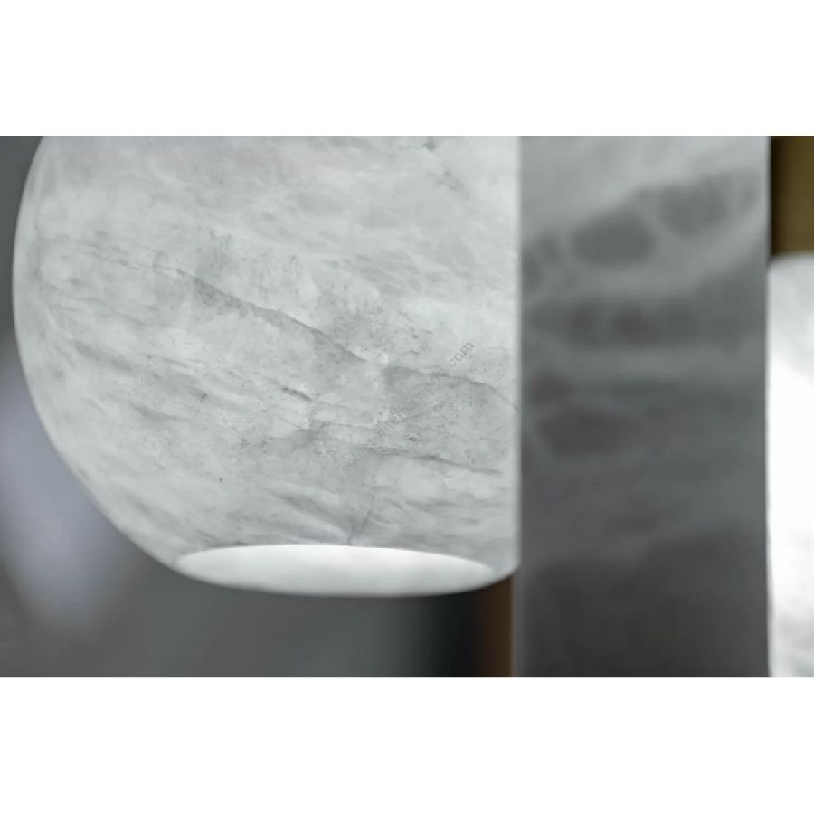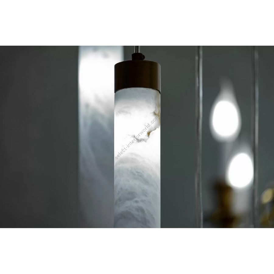 The alabaster tubes and spheres supported by simple brass parts in a light satin finish form a suspension where the elements are placed at different heights. Simple and essential shapes where the lighting enhances the natural veins of alabaster. Each piece is different from the other, a gift from nature to embellish rooms of every era and style from the most classic to the design.