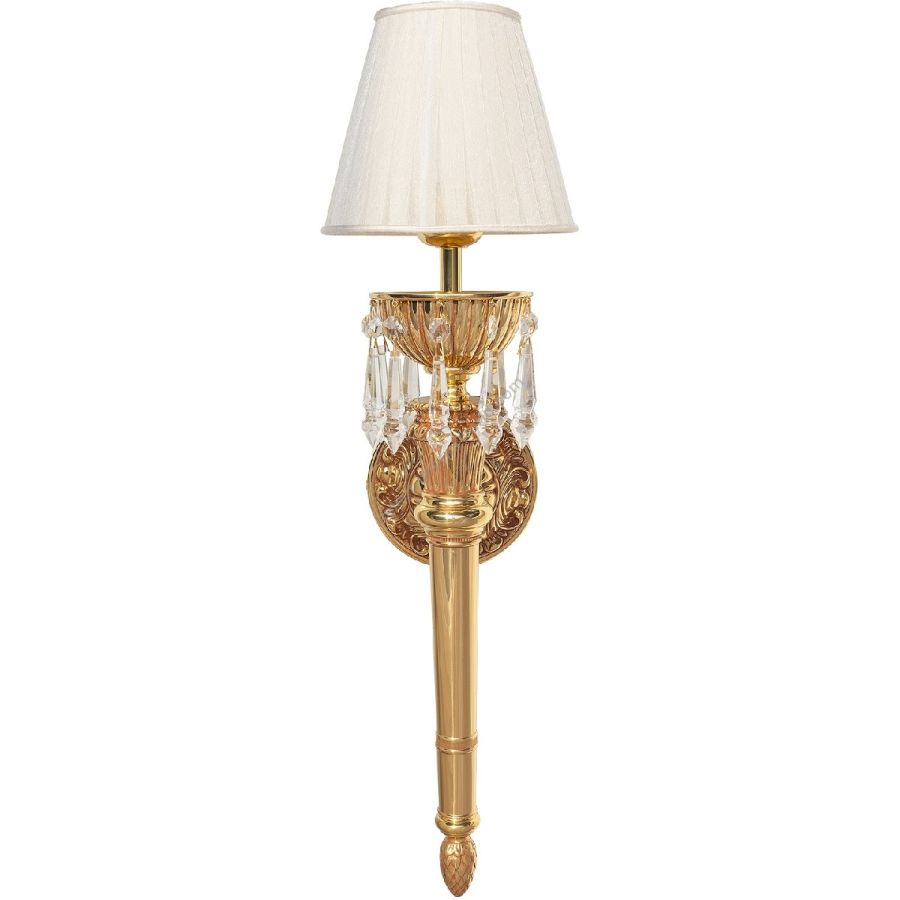 Flexible brass wall light in French gold finish with Schoeler crystal drops and pleated organza shade, suitabke for any classic decor