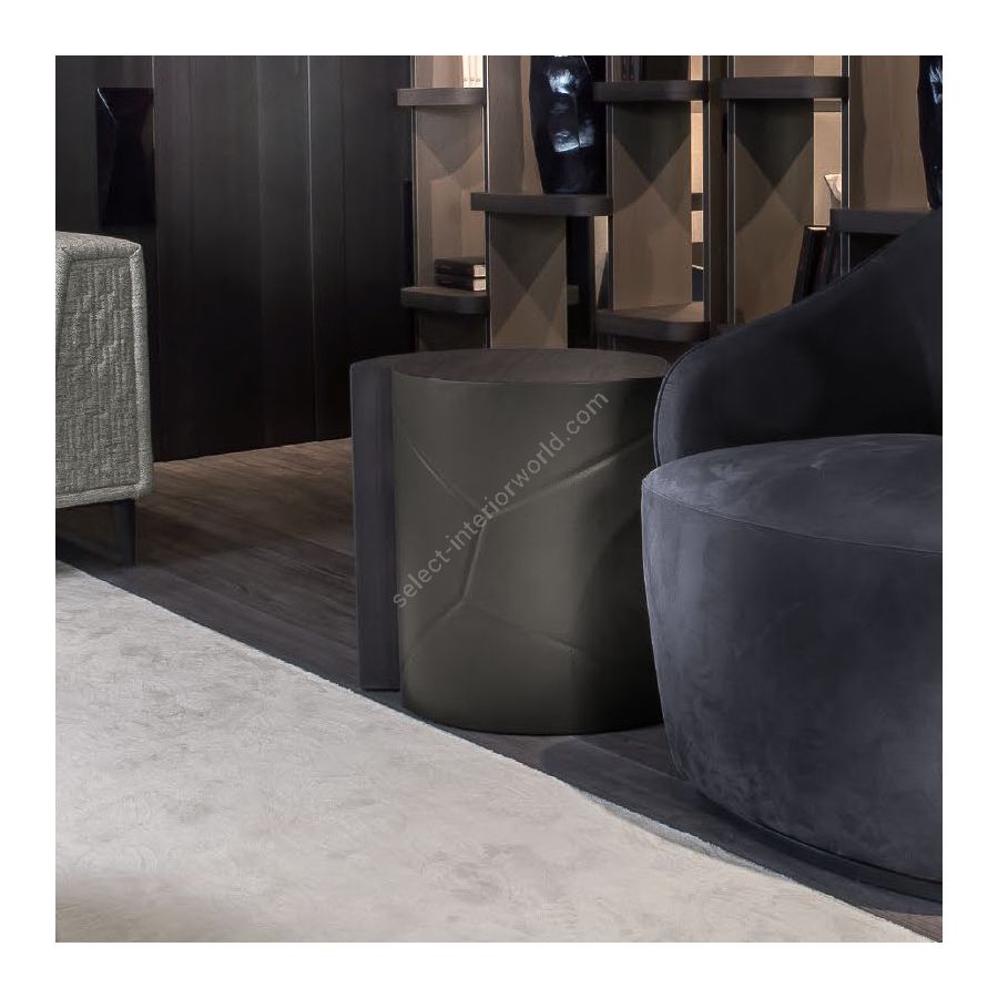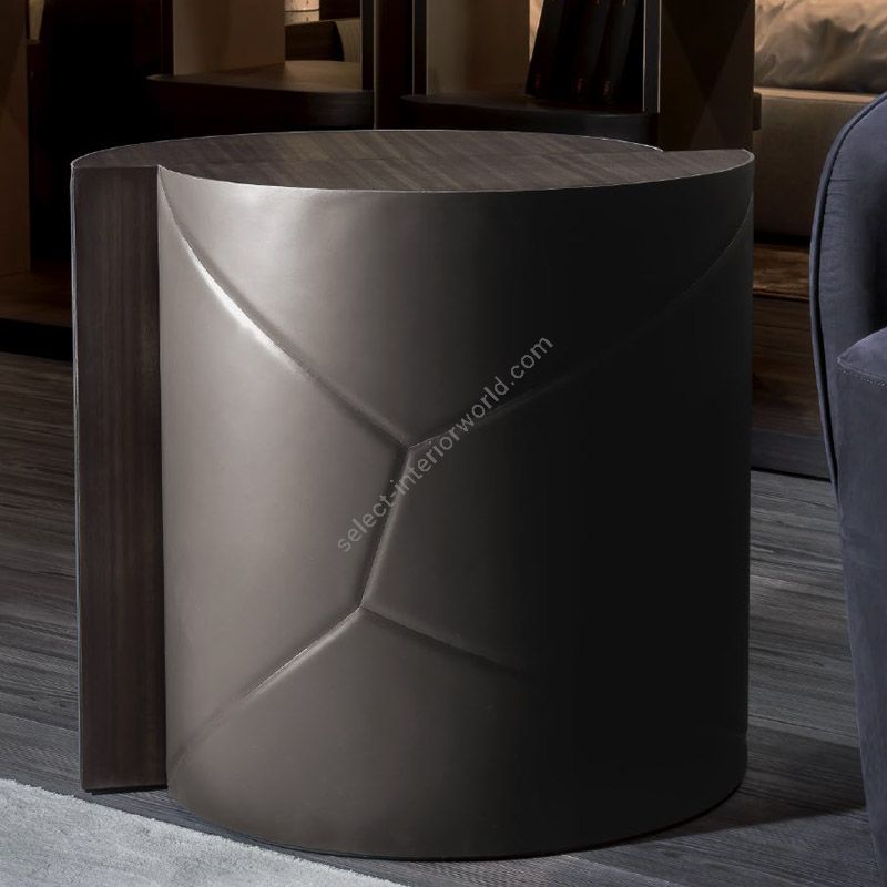 Coffee table with poplar plywood structure with curved sides covered in leather. Top in MDF coated poplar plywood with lacquered finish.