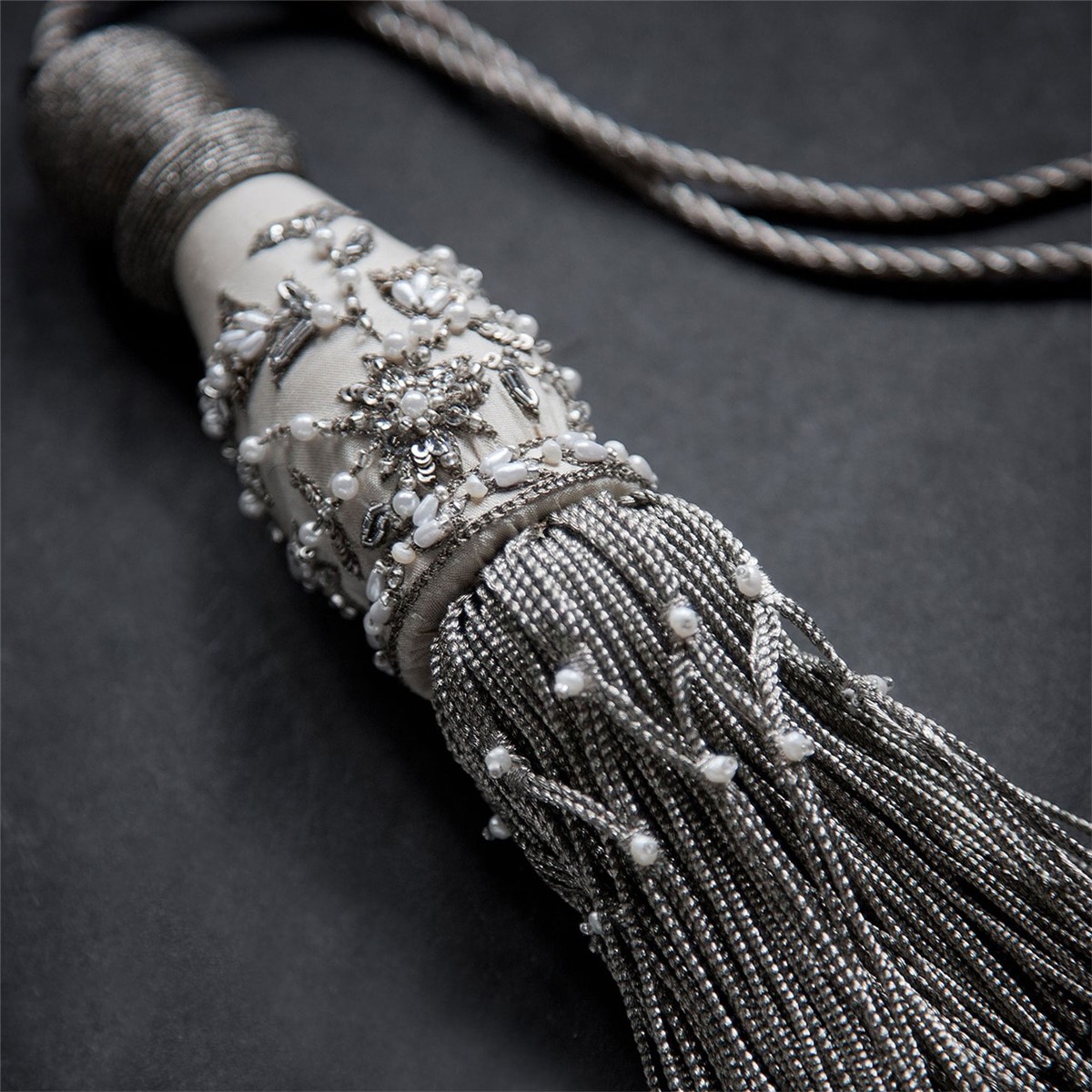 Our Couture tie backs are bespoke and hand crafted to order. They can be made in fine gold, silver bronze, pewter or silk threads and embellished with freshwater pearls and semi-precious stones.