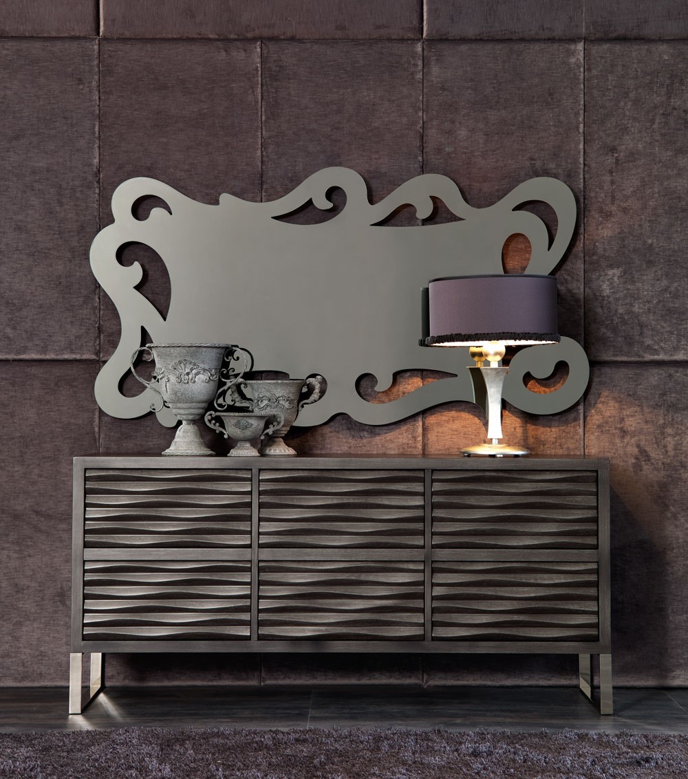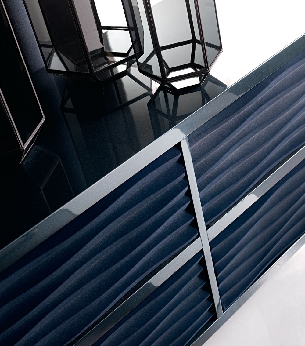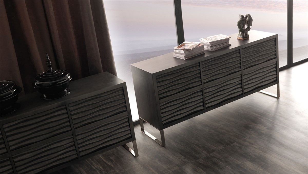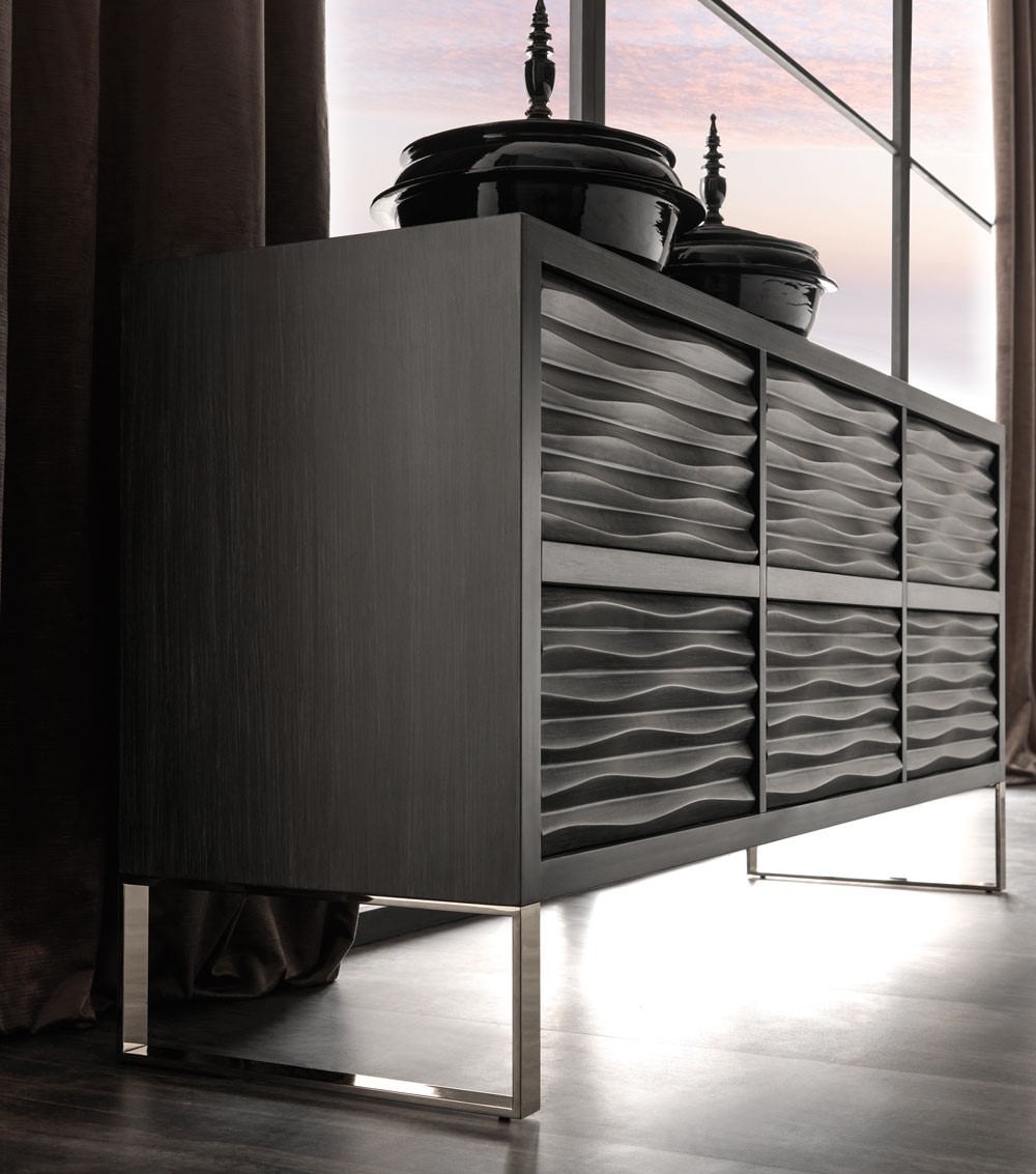 Wooden chest of drawerswith a modern-contemporary line made with a precious carved wave pattern. Available in 4 or 6 drawer version with push-pull opening.