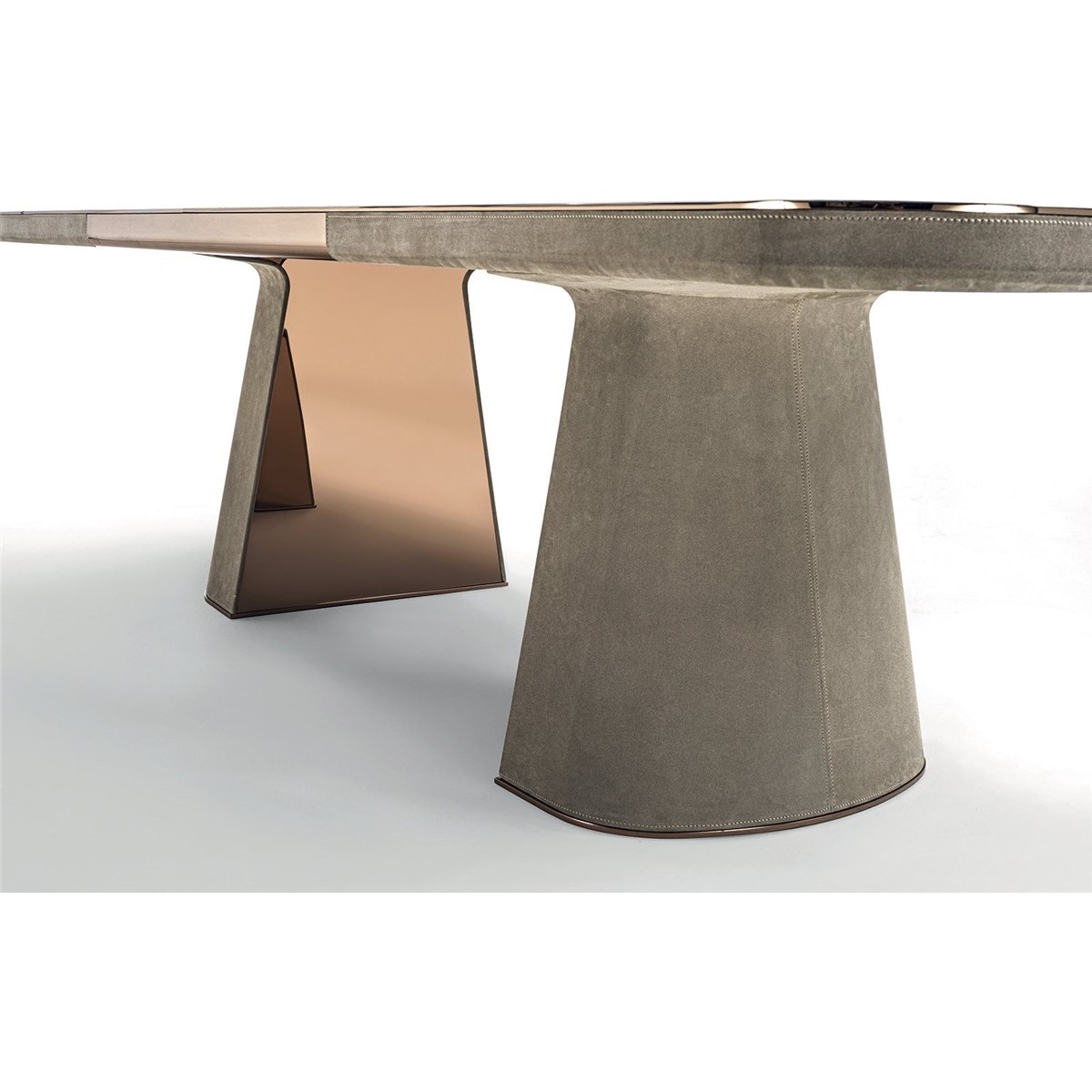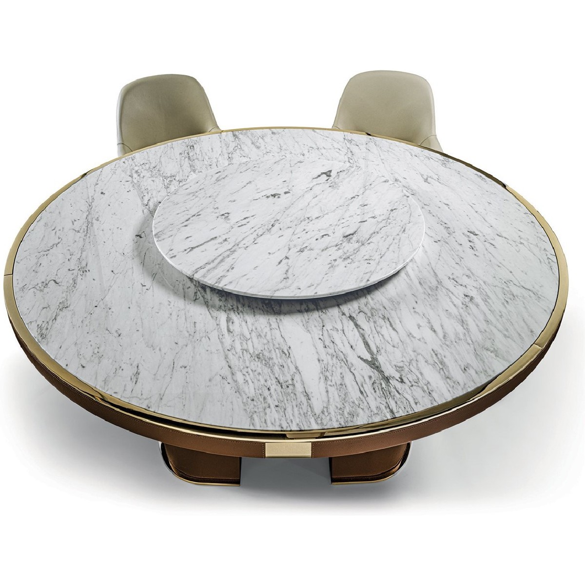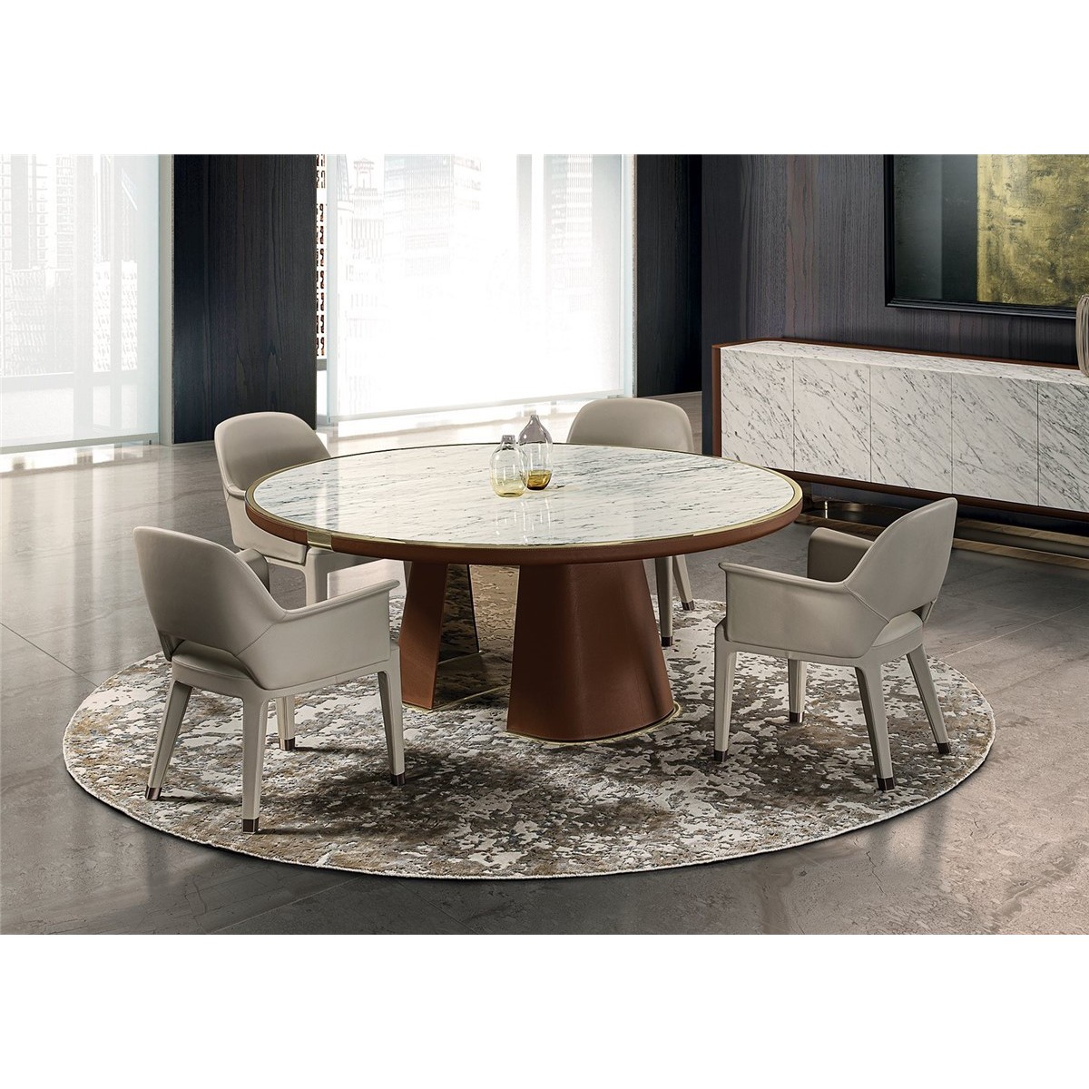 Table with 2 legs in glass fibre, covered externally in leather and internally in metal sheet in the following finishes: Satin nickel, Bright shaded brown, Black Rose gold, bright light gold, matt Champagne gold, bright chrome, bright black chrome, matt satin bronze, bright pink gold, matt pink gold. To complete the leg, thebase is enhanced with a metal foot in the same finish as the plate. The undertop is covered in leather fromthe catalogue, like the leg, and decorated with metal inserts coordinated with the metal sheet on the base. The top has a perimeter border in metal that encloses the top, in the finishes: White Carrara marble, ImperialBrown marble, Sahara Noir marble (glossy and matt polyester finish), Dover White marble, PandaWhite marble, Guatemala Green marble, Corteccia marble, Port Saint Laurent marble, Red Levanto marble, Bardiglio Nuvolato marble, Elegant Brown marble, Shale Rosewood marble, Emperador Dark marble, SilverWave marble, Agatha Black marble, Frappuccino marble, Calacatta marble, Fusion Light marble, Patagonia marble, Explosion Blue marble, Fusion Multicolor marble, Juliet Quartz marble. A lazy susan (cm Ø 75-90-110) is available to set on the top, in the finishes: glossy lacquered wood in range colours, glossy/matt Maple, glossy/matt heat-treated Eucalyptus, glossy/matt Sycamore frisè, glossy/matt Ebony, glossy/matt Canaletto walnut, glossy Walnut burl wood or in marble in the varieties listed in the catalogue.