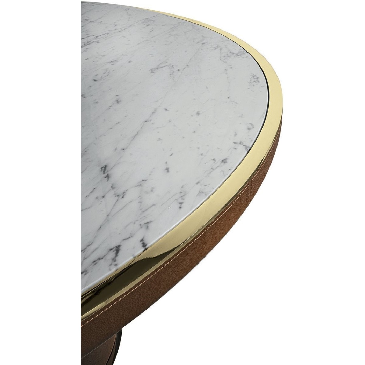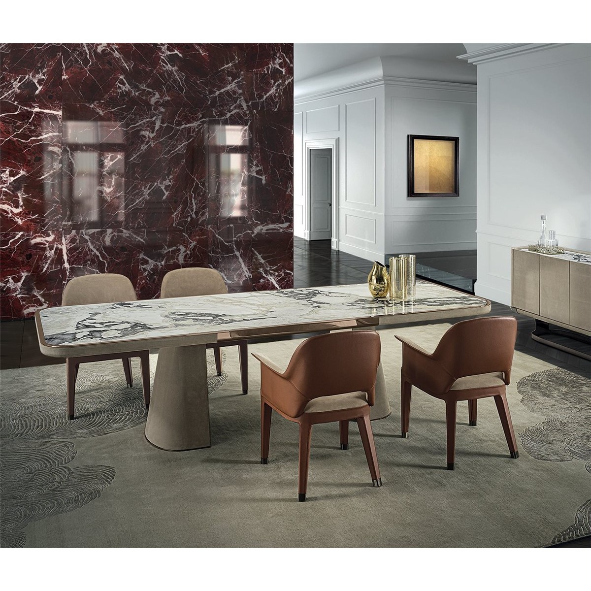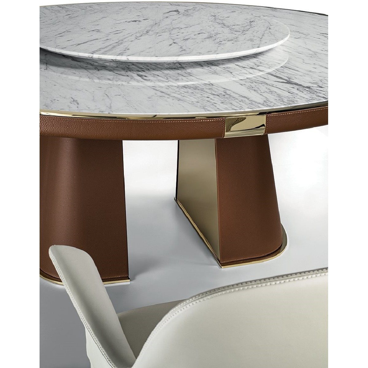 Table with 2 legs in glass fibre, covered externally in leather and internally in metal sheet in the following finishes: Satin nickel, Bright shaded brown, Black Rose gold, bright light gold, matt Champagne gold, bright chrome, bright black chrome, matt satin bronze, bright pink gold, matt pink gold. To complete the leg, thebase is enhanced with a metal foot in the same finish as the plate. The undertop is covered in leather fromthe catalogue, like the leg, and decorated with metal inserts coordinated with the metal sheet on the base. The top has a perimeter border in metal that encloses the top, in the finishes: White Carrara marble, ImperialBrown marble, Sahara Noir marble (glossy and matt polyester finish), Dover White marble, PandaWhite marble, Guatemala Green marble, Corteccia marble, Port Saint Laurent marble, Red Levanto marble, Bardiglio Nuvolato marble, Elegant Brown marble, Shale Rosewood marble, Emperador Dark marble, SilverWave marble, Agatha Black marble, Frappuccino marble, Calacatta marble, Fusion Light marble, Patagonia marble, Explosion Blue marble, Fusion Multicolor marble, Juliet Quartz marble. A lazy susan (cm Ø 75-90-110) is available to set on the top, in the finishes: glossy lacquered wood in range colours, glossy/matt Maple, glossy/matt heat-treated Eucalyptus, glossy/matt Sycamore frisè, glossy/matt Ebony, glossy/matt Canaletto walnut, glossy Walnut burl wood or in marble in the varieties listed in the catalogue.