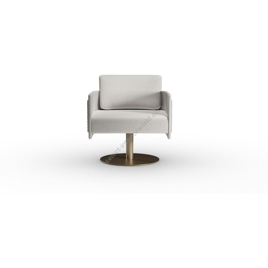 Armchair with wooden structure with upholstered seat and back in different densities with movable back cushion. Upholstery in fabric or leather. Available with wooden legs or with swivel metal base in Bronze, Brass, dark Brass or Titanium finish. Highlight of the armchair the optional outer cover in fabric or leather, that can be customized with the quilting according to project requirements.
