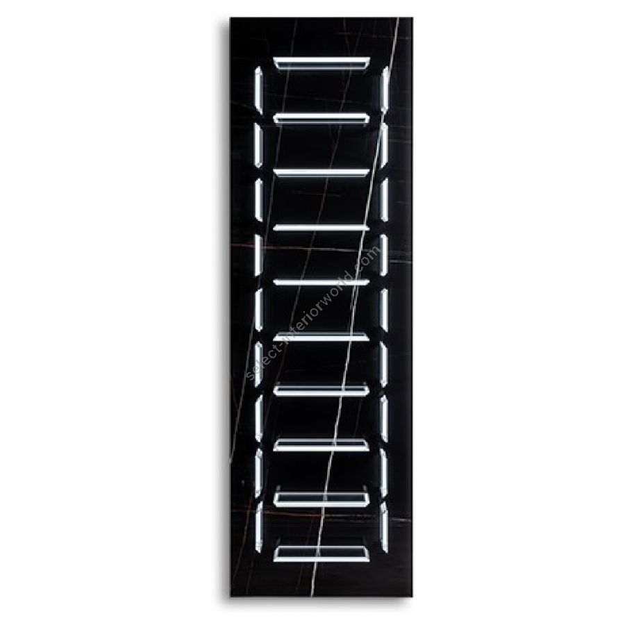 Luminous bookcase made up of a panel in MarmoReflex or LegnoReflex and backlit glass shelves with a prismatic shape. Possibility of having stainless steel bottle holders to transform the luminous bookcase into a wine cellar.