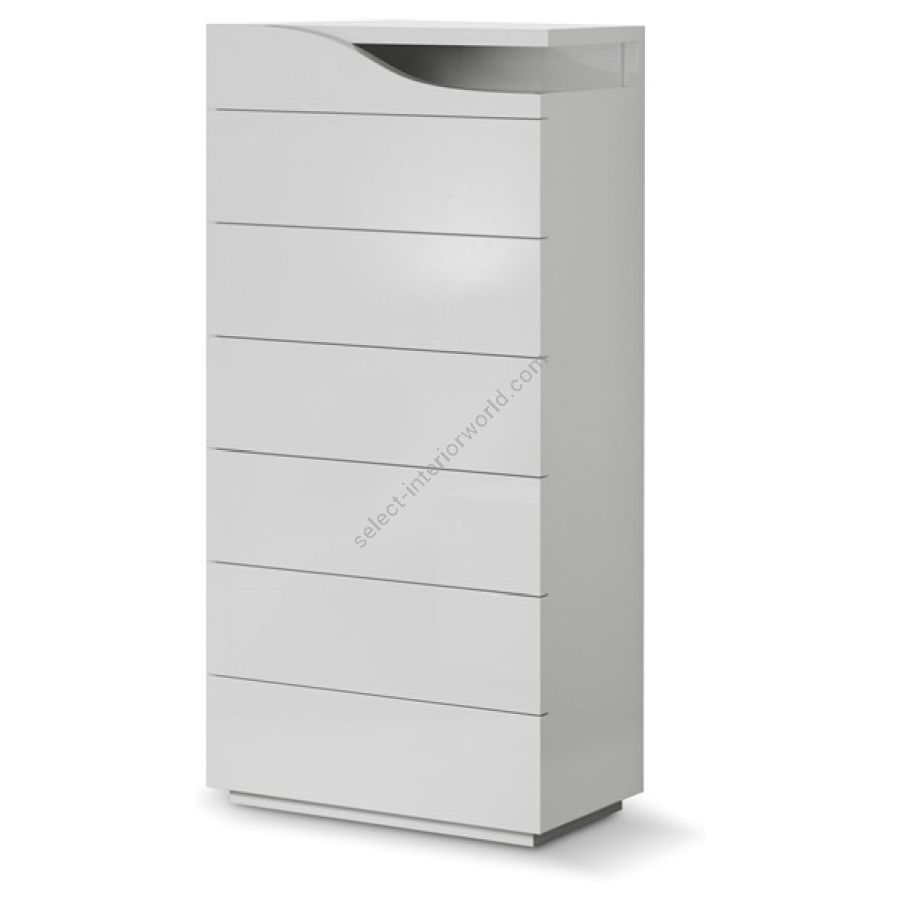 High chest of drawers in shiny lacquered wood or in Canaletto Henné finish. Top drawer with shaped front and open compartment