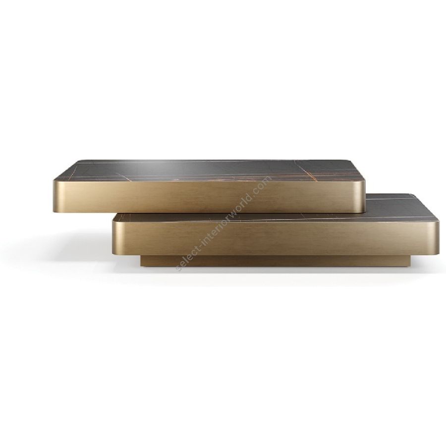 Coffee table with double top, one fixed and other sliding. Structure in brass 104M, dark brass 105M or Titanium 101M. Plinth in bronze 100M. Both tops or in MarmoReflex/LegnoReflex or in smoked mirror glass.