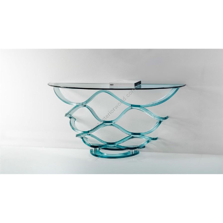 Console in curved 24 mm thick glass, transparent, black lacquered or in satin brass, dark brass, titanium finish. Glass top 15 mm thick with 45° bevel.