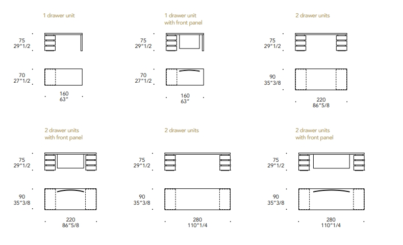 Desk in wood shiny lacquered, shiny ebony or Canaletto walnut/Canaletto Henné. Single or double drawer’s unit with partitions in etched glass with internal lighting. Wooden top with insert in lacquered glass for shiny lacquered version. Optional front panel and cable-hole.
