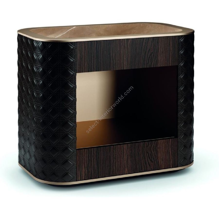 Night-stand with 2 drawers in shiny lacquered wood, in shiny Ebony or in Canaletto Henné. Sides upholstered in leather or fabric with quilting. Details on the top in brass finish. Open space with LED lighting. Top in Marmoreflex/Legnoreflex.