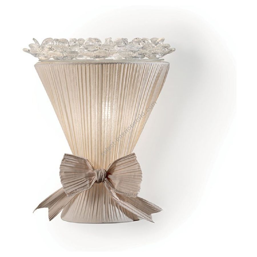 Wall lamp with iron support, lampshade in ivory pleated fabric and sandblasted glass cover with flower decorations in transparent Murano glass. LED system