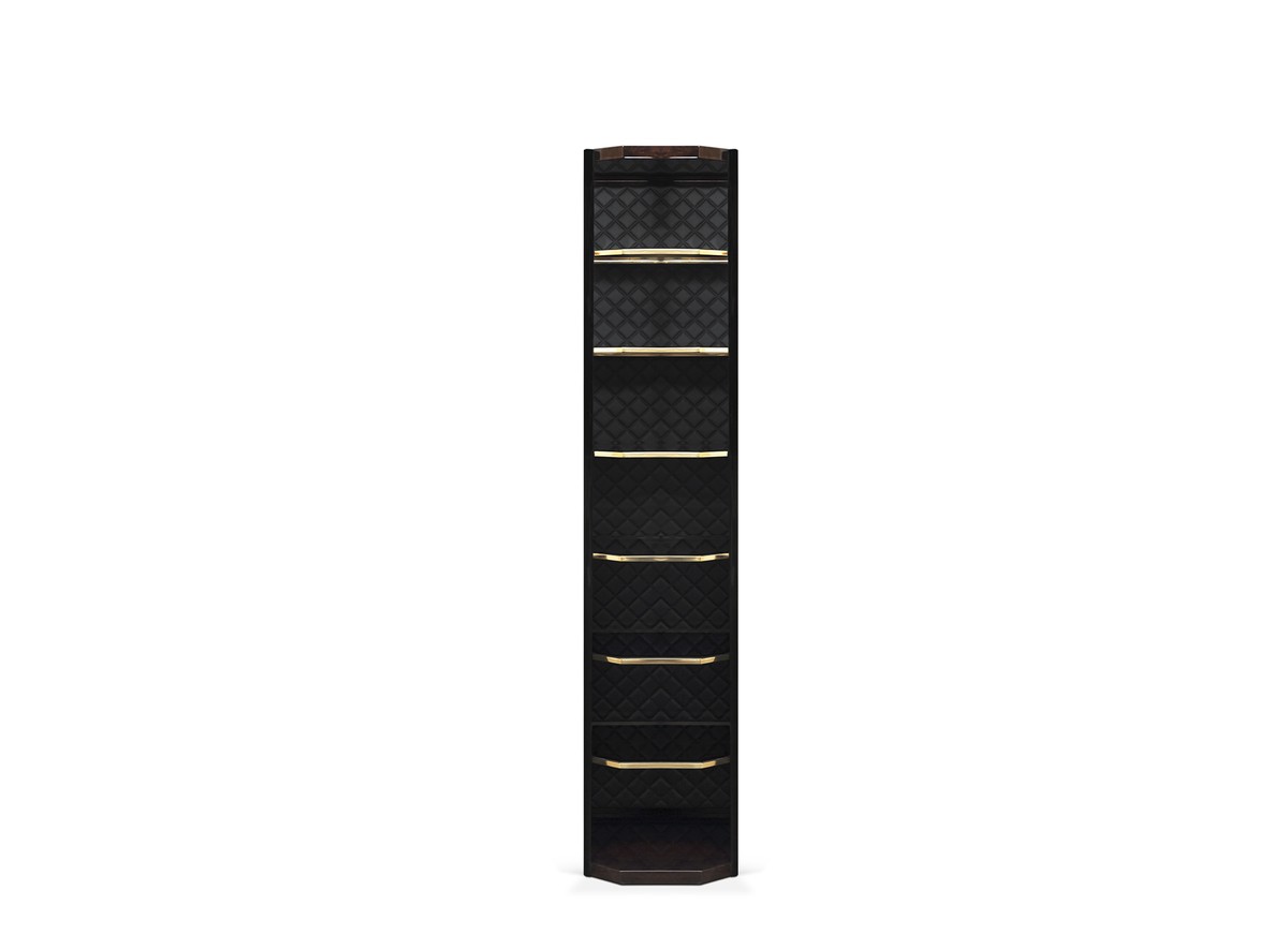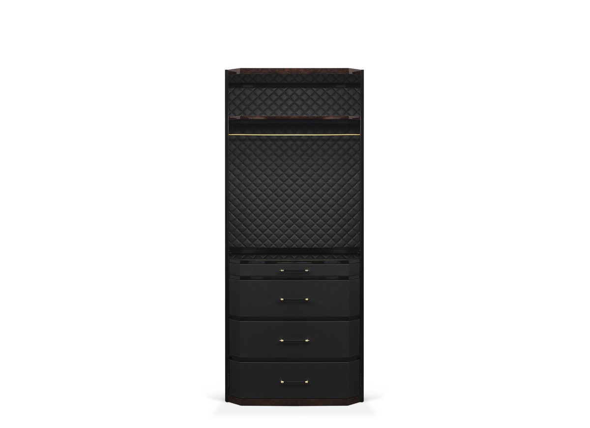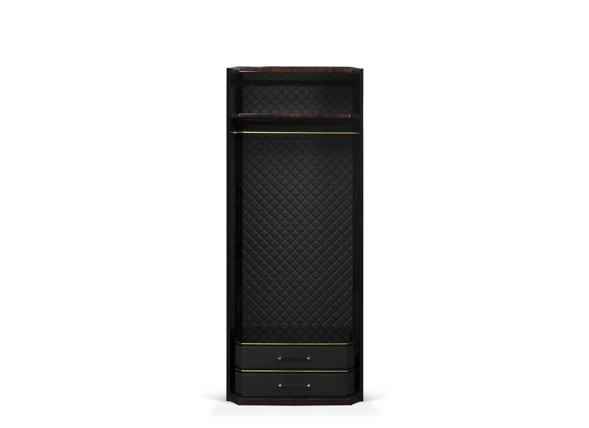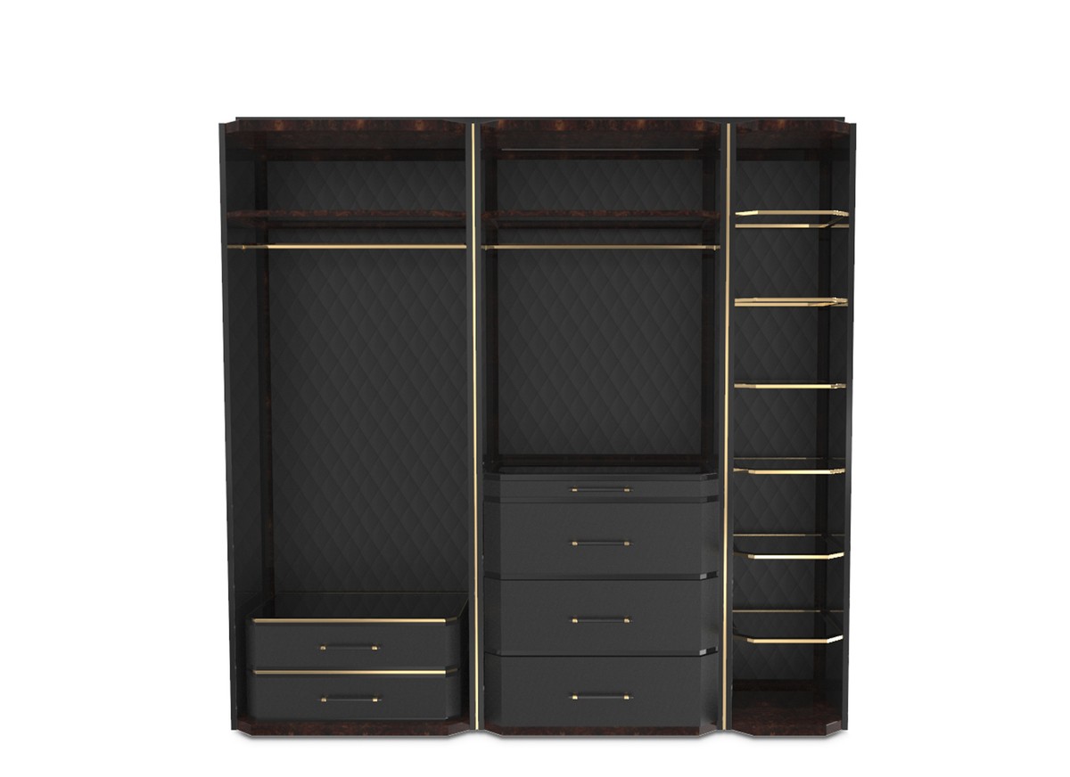 The Waltz Closet is an elegant, modular clothing storage solution made with the finest materials, such as walnut root veneer, black leather, black lacquered wood, brass, and smoked glass. This luxury storage solution is perfect for a modern master bedroom, offering a fully customizable organization system with shelves, rods, and drawers. This modular piece allows for different module combinations, ensuring a perfect fit for your space.