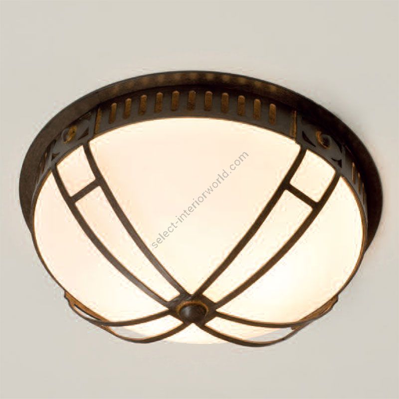This ceiling lamp of regular round shape is made of blown glass for the lampshade and the wrought iron for the base by the craftsmen of Robers (Germany). The fixture is fully handcrafted at the plant of the brand. It provides for sustainability and water-resistance. Three bulbs make this lamp a powerful source of light. The classic design will match any space, especially thanks to the wide range of finishes offered by the craftsmen. The fixture is discreetly decorated by the flat iron rods and horizontal strap with the holes.
