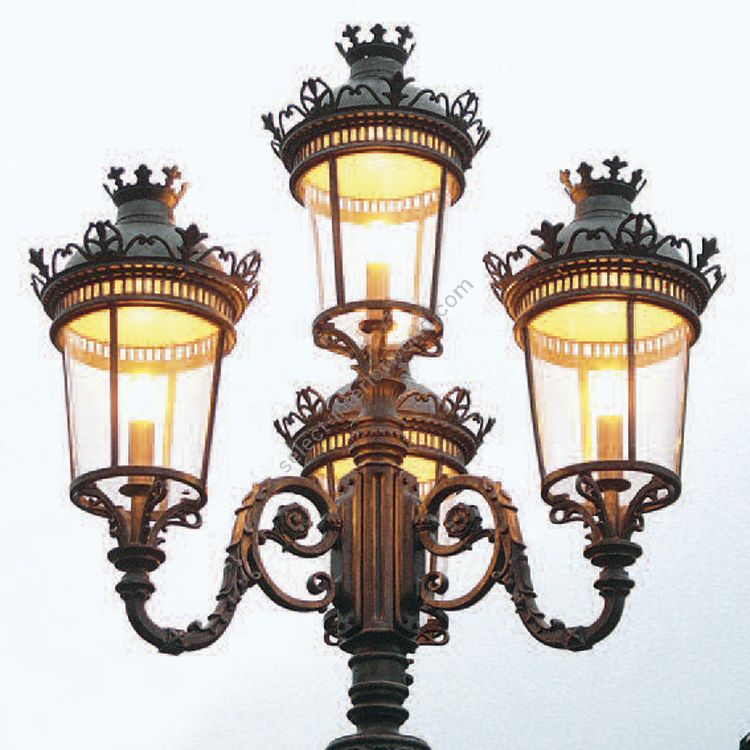 This classic post lamp belongs to the outdoor collection of the German brand Robers whose fixtures are handcrafted of iron, steel, and copper processed in different ways to become sustainable and water-resistant, which is important for outdoor use. This post lamp is distinguished by its above average height and powerful source of light provided by four lanterns. It is solid and massive in the lower part, the column is richly ornated by the carving with floral elements. The shades of each lantern of blown glass are tinted into an antique finish and covered by the roofs that keep the same style of decoration, demonstrating the whole design is inspired by the Victorian and Classic styles. The fixture is available in 12 finishes to choose from.