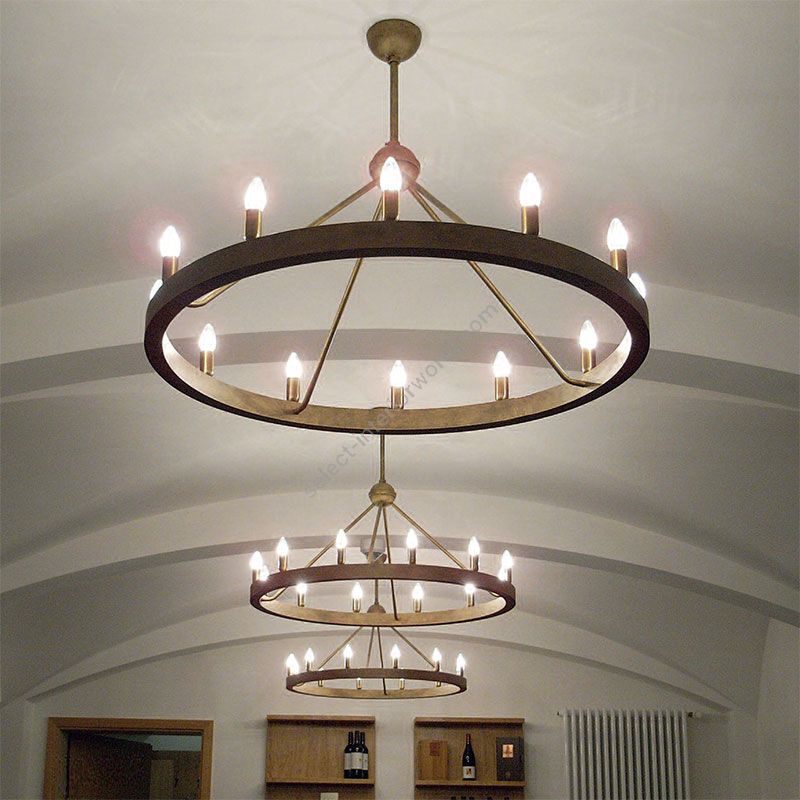 A suspension lamp of wrought iron with candles belongs to the “Indoor” collection of the German brand Robers. The iron base, as well as the candle holders, are all handcrafted. This big suspension lamp becomes a beautiful statement in the room showing the excellent taste of the owners. It consists of one layer of iron decorated by twelve candles that serve as the source of light. The round base is connected to the canopy with 4 tubes. The final height of the fixture is made according to the customer’s requirements. Choose one of 10 finishes for the base to get a suspension lamp that entirely suits the interior design. Every finish is painted manually in several phases and may be slightly different from the photo.