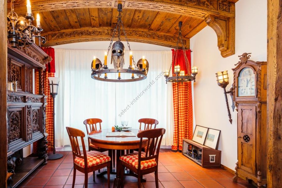 Suspension lamp from the collection “Indoor-8” by Robers (Germany) is one of the solutions in a candelabra-style design from the same line. These lamps differ by the size and some decorative elements. The suspension lamp is made of the wrought iron in a traditional way - by hand. The glass lampshades are placed into elegant holders, each is connected with the base ring with a tube. These lampshades are another element to pay special attention to: each of the four is made of frosted glass manually and has an effective shape of the edges. The base ring is attached to the final canopy by the chains. The designer suggests 10 options for the finish of the base, but keeps the glass lampshade in an amber finish to add a warm and cozy mood to the whole design.