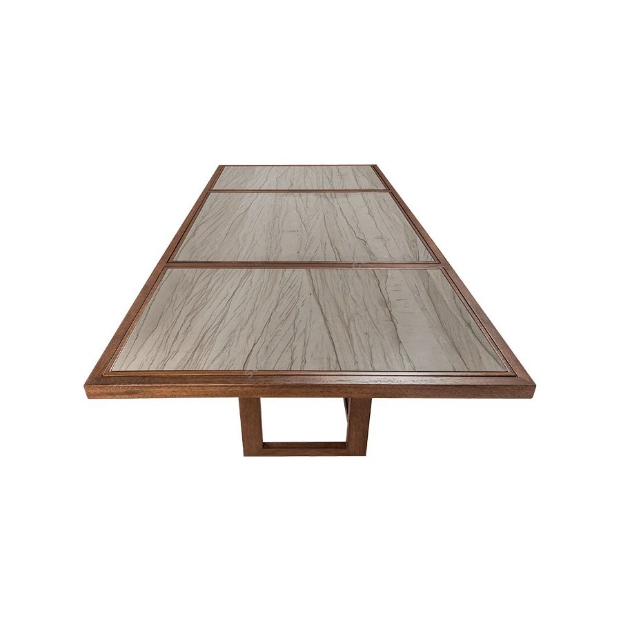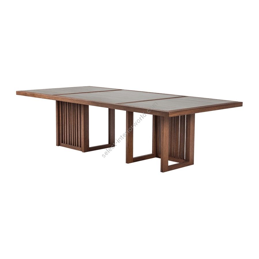 From the Rumba collection, with the same design but larger dimensions of the Rumba Dining Table 300. Instead of the wooden top, it can be combined with quartzite or marble inlays for more elegance.