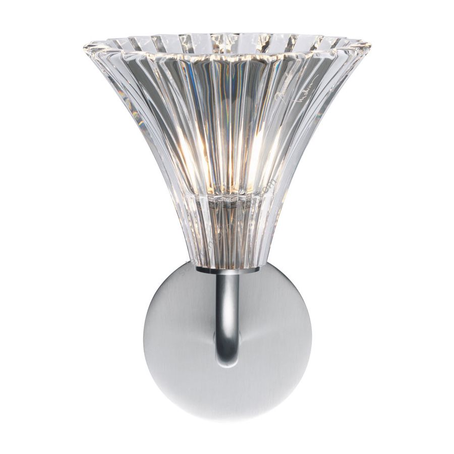 This Mille Nuits tulip wall sconce glimmers whether or not the lamp is illuminated. The flowerbud-like silhouette gradually fans out from the round base. The sconce pivots 180 degrees, directing the glow anywhere between ceiling and floor, with the beveled cuts of the cup enhancing the light-scattering properties all the more. The tulip wall sconce is available in luminous Clear crystal, and Baccarat’s signature red hue. Designed by Mathias for Baccarat, the Mille Nuits collection references the 1001 Tales of The Arabian Nights. The collection also includes other lighting fixtures (from candelabras to chandeliers), as well as bar and tableware (from champagne flutes to dessert plates).
