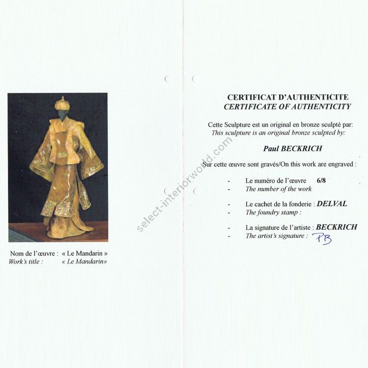 “Le Mandarin” is a refined bronze sculpture by French artist Paul Beckrich, renowned for his expressive, ethnically inspired figurative works. This piece captures the dignified posture and ceremonial attire of a Chinese imperial official, evoking the elegance and authority of the Qing dynasty.