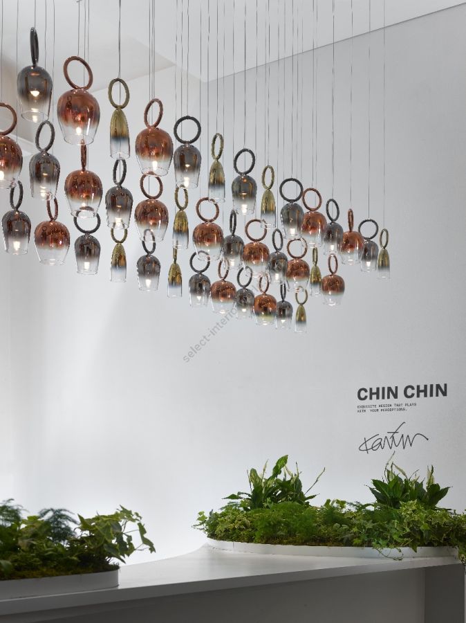 Exquisite design that plays with your perceptions. The CHIN CHIN collection is formed of crystal components shaped into golden drinks glasses, available in three playful designs – red wine, white wine, and champagne. Each piece is suspended from a flawless glass ring and finished with gradient nanocoating. The effect is a perfect paradox. The glasses look full but they are empty, they hang upside down but nothing spills. This design is both opulent and contemporary, creating a dramatic focal point for your interior.