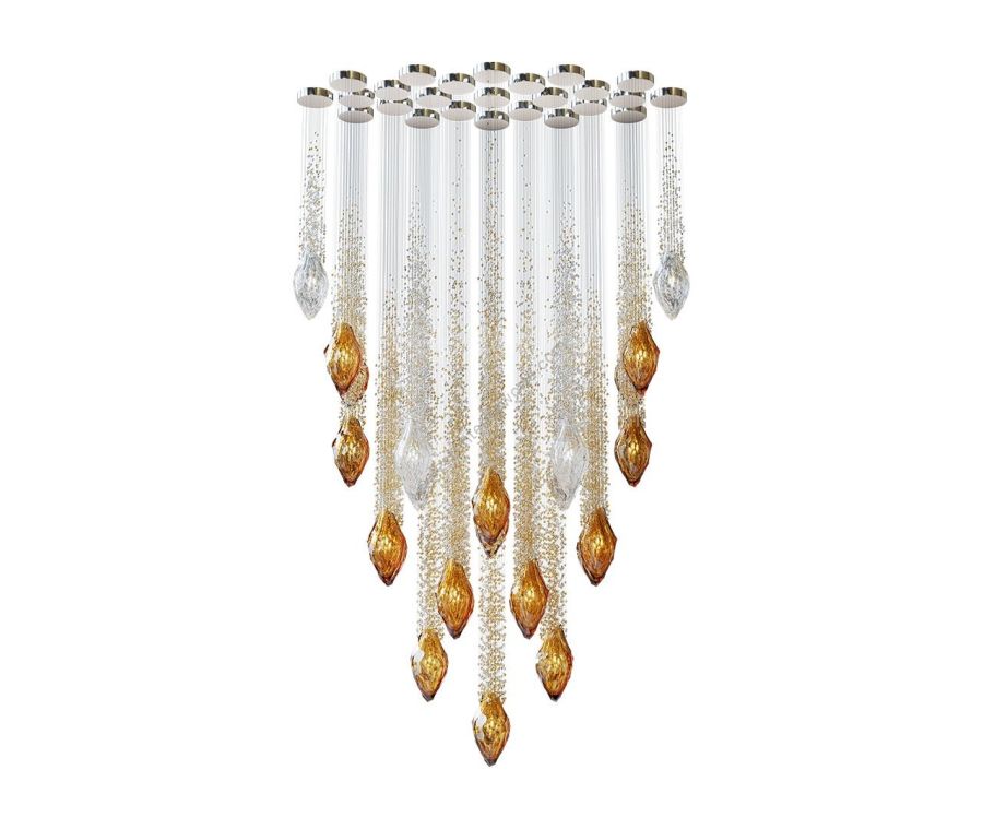 Capturing the beauty of a comet streaking through the night, the Flash collection features handblown crystal gems, each followed by a tail of glittering beads. Cascading downward, they create a bold installation that fills any interior with vibrant light and movement.