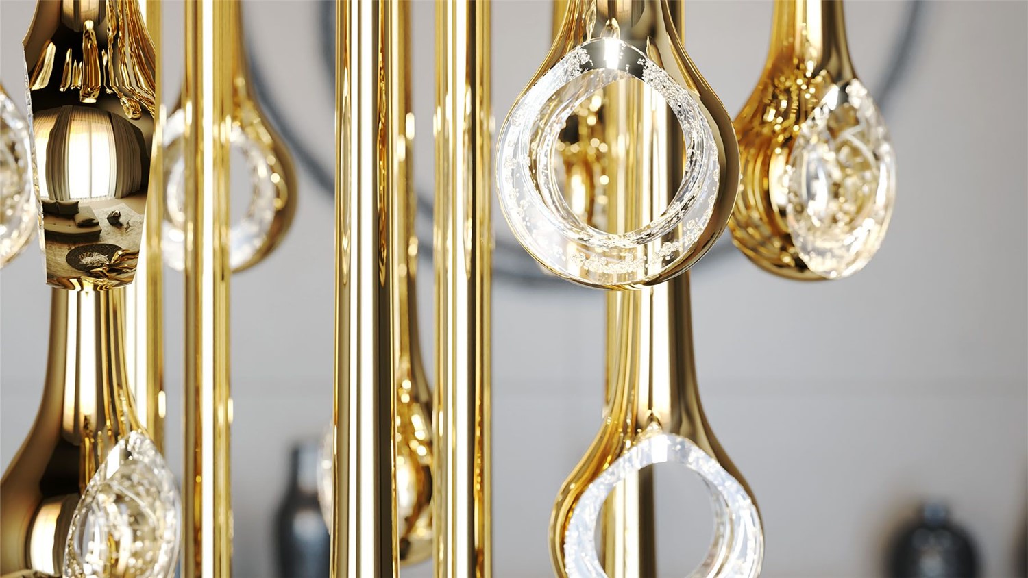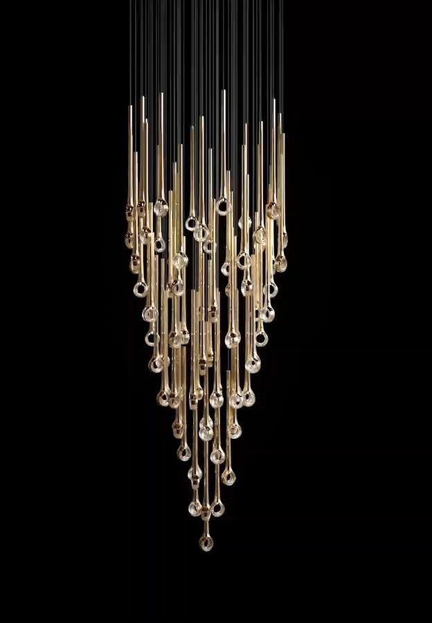 The Eyelet collection creates a striking visual with its sleek, elongated forms suspended from the ceiling, resembling polished needles. Each piece is enhanced with metal nanocoating, giving it a reflective finish, that captures and refracts light, adding an interplay of shimmer and depth.