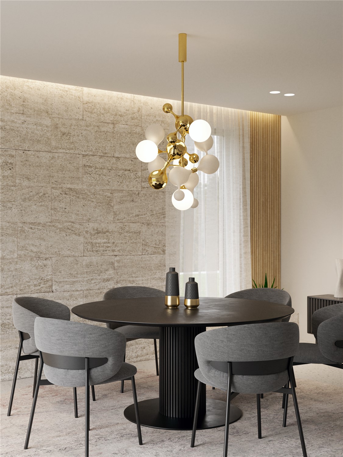 The PARTICLES collection features magnificent chandeliers formed of interconnecting complex glass shapes inspired by the microscopic design of powerful joy hormones – serotonin, dopamine and adrenaline. The glass components are finished in crystal, sandblasted and aurum nanocoating and fitted around a polished brass stem, to create bold artistic centrepiece for your space.