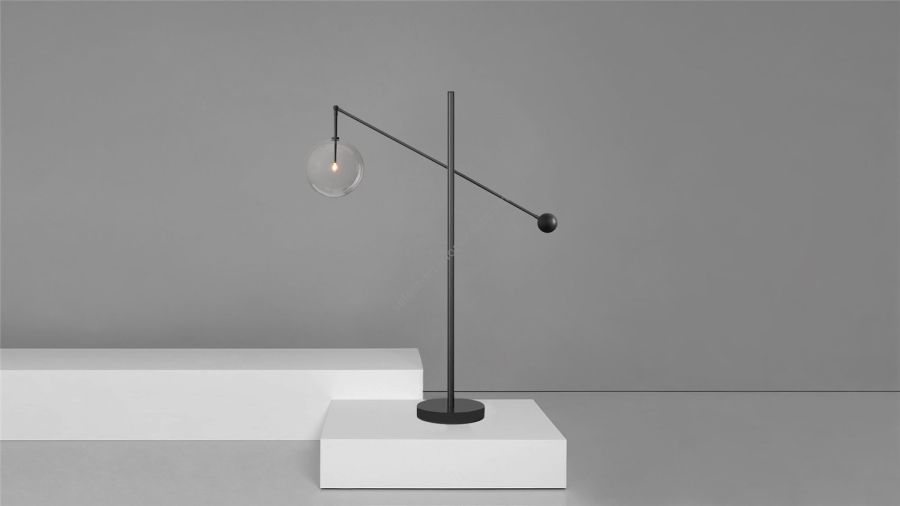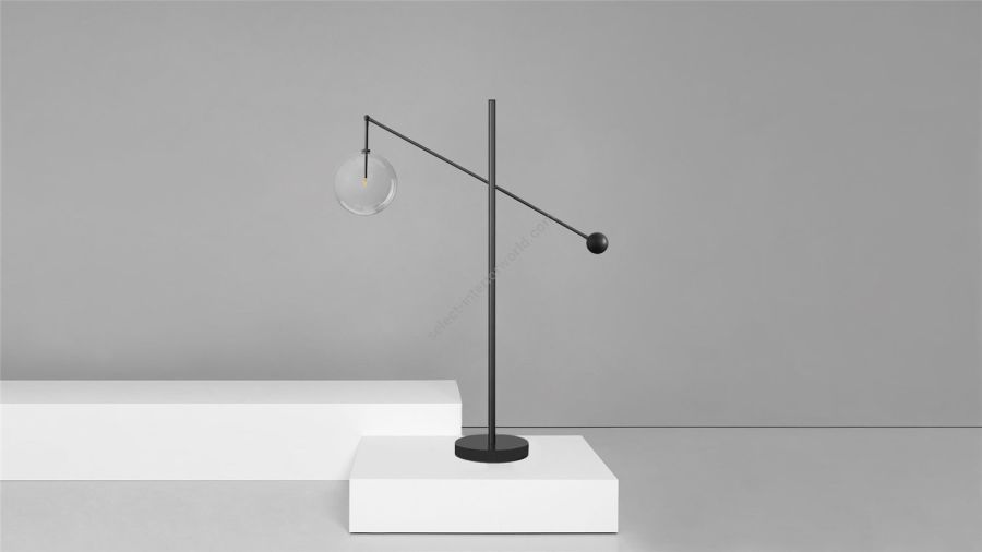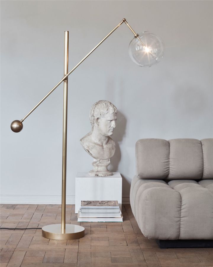 This free-standing adjustable lamp strips the classic cantilevered silhouette back to its bare essentials, retaining its sense of style and play. A striking, angular form, derived from the dynamic balance between illuminated glass globe and brass counterweight.