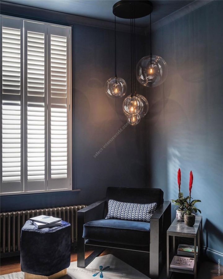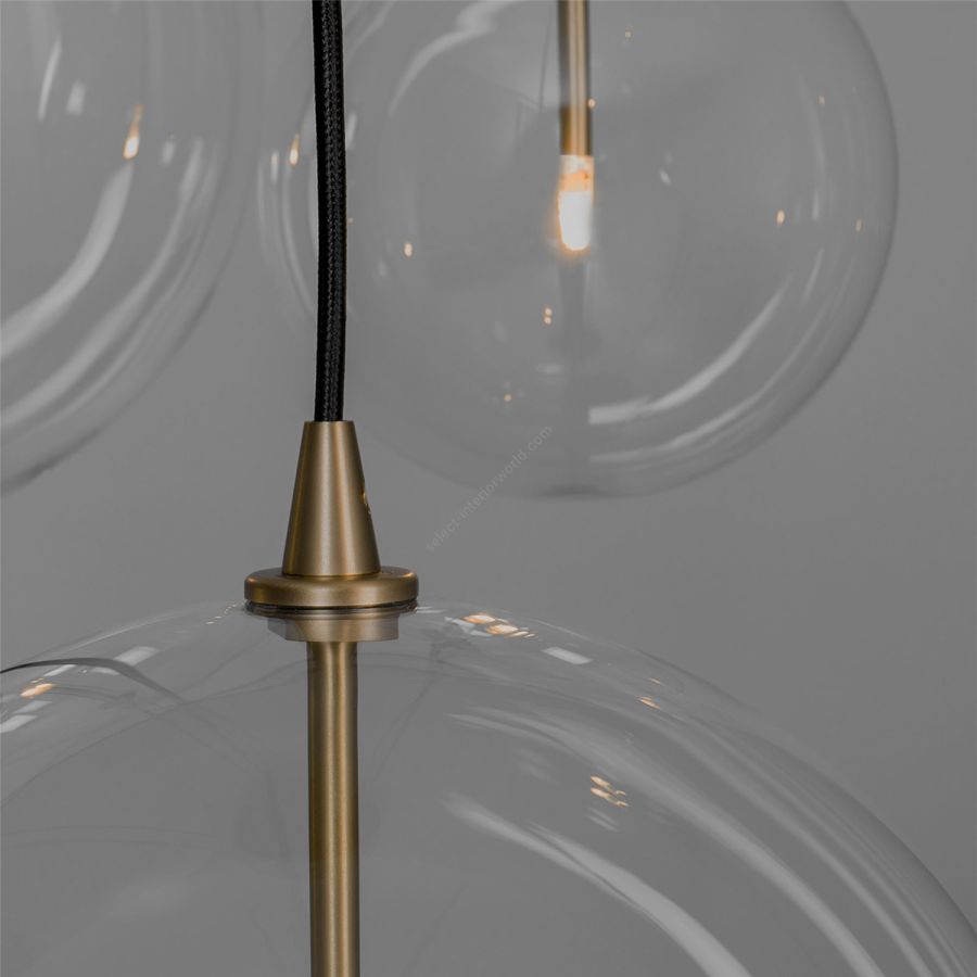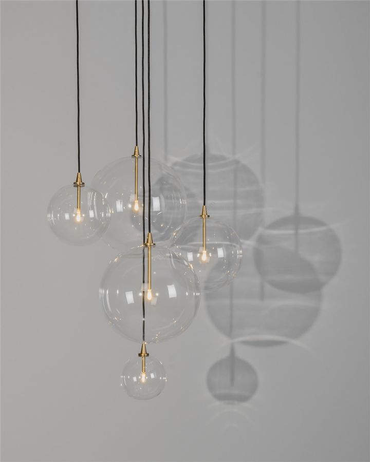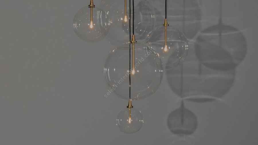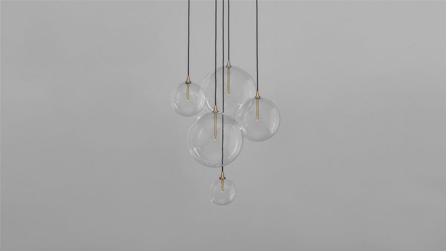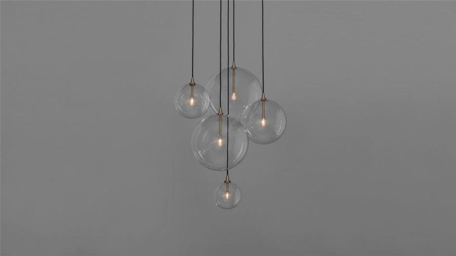 An arrangement of five glass globes suspended from a discus of brass forms a serene ceiling constellation. A range of diameters creates the impression of a flock of spontaneous soap bubbles, floating weightlessly in the air.