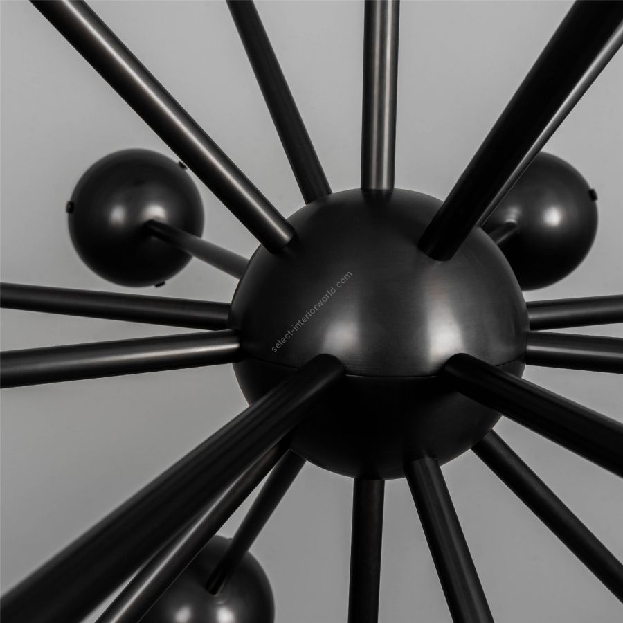 Sparks of light trail brass lines in a circular formation. Radiating out from a spherical nucleus, ten sprightly rods wield illuminated hemispheres, a spectacular spatial punctuation